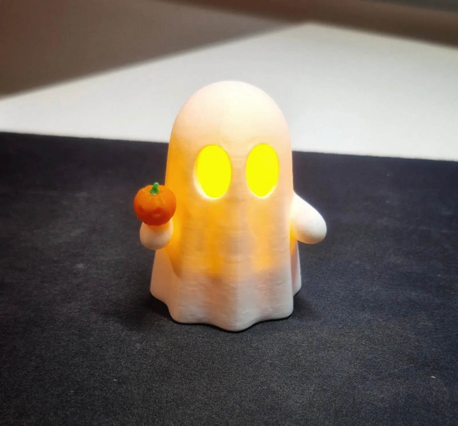 Nhớ in mẫu không cần support để bề mặt mịn hơn. Bạn có thể đặt một đèn LED tea light bên trong để làm sáng phần mắt và quả bí, giúp chú ma dễ thương “sống dậy”.