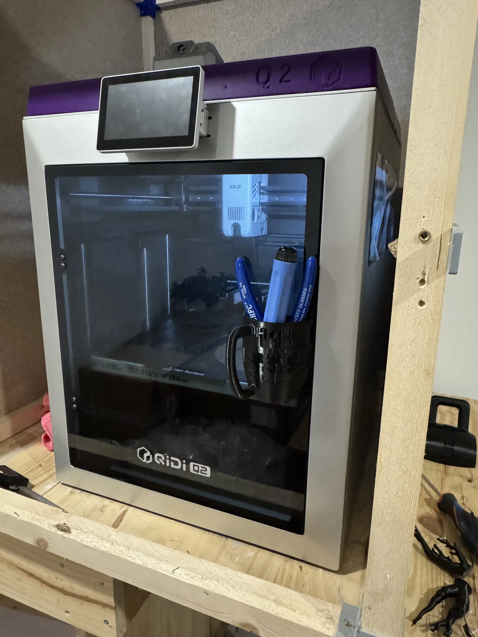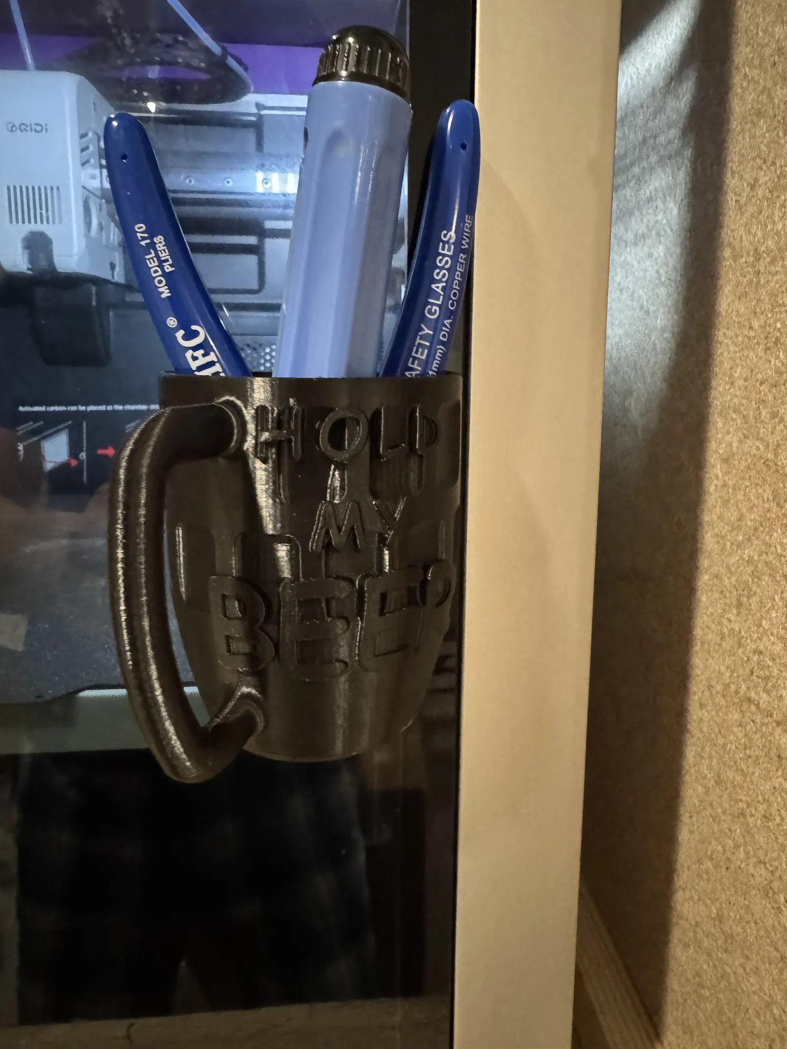 Tay nắm cửa mới vui vui cho máy in Qidi Q2. Hold My Beer. Bên trong có chỗ để cất kềm cắt (side cutter) và dụng cụ gọt ba via (deburring tool).