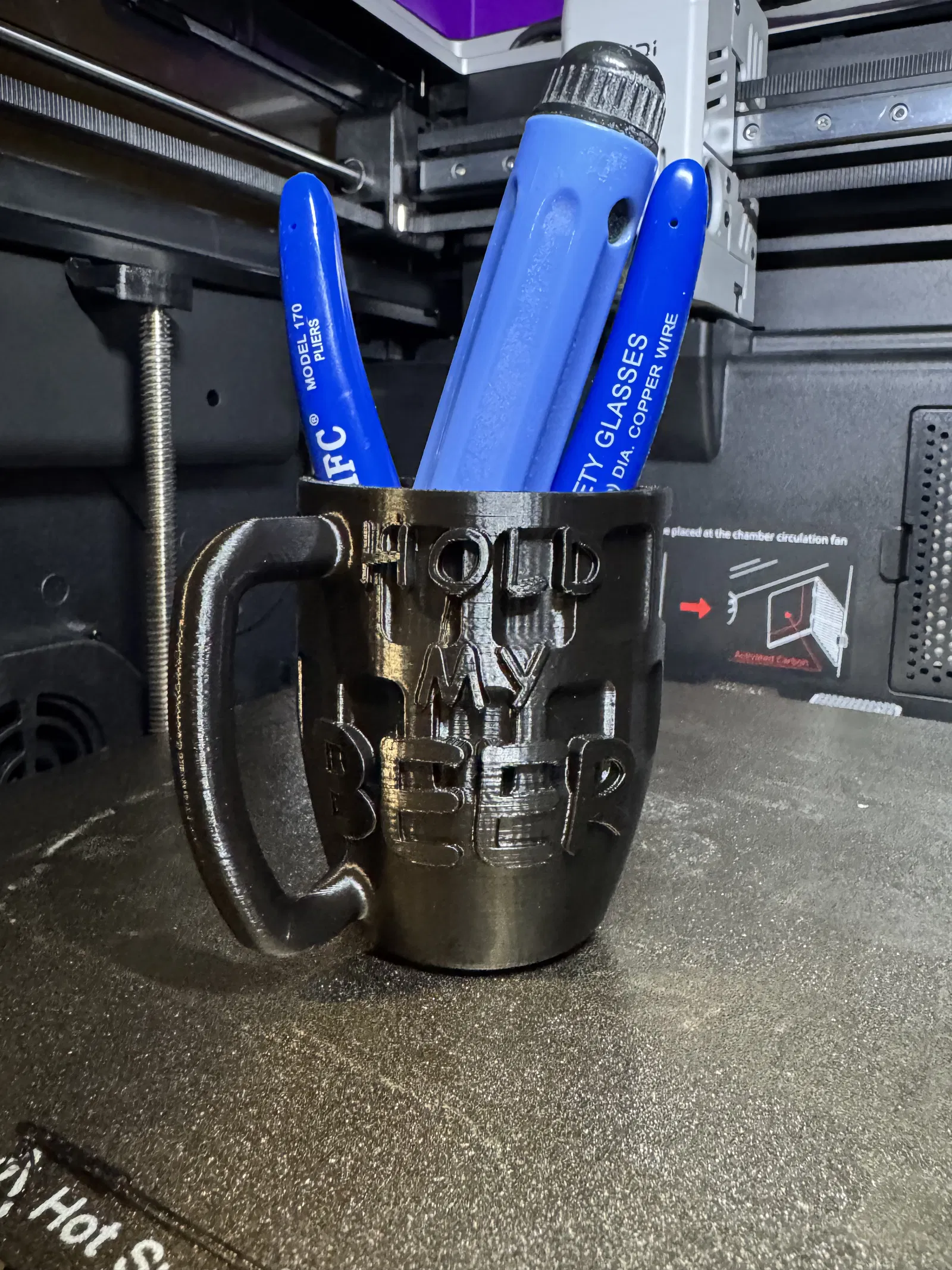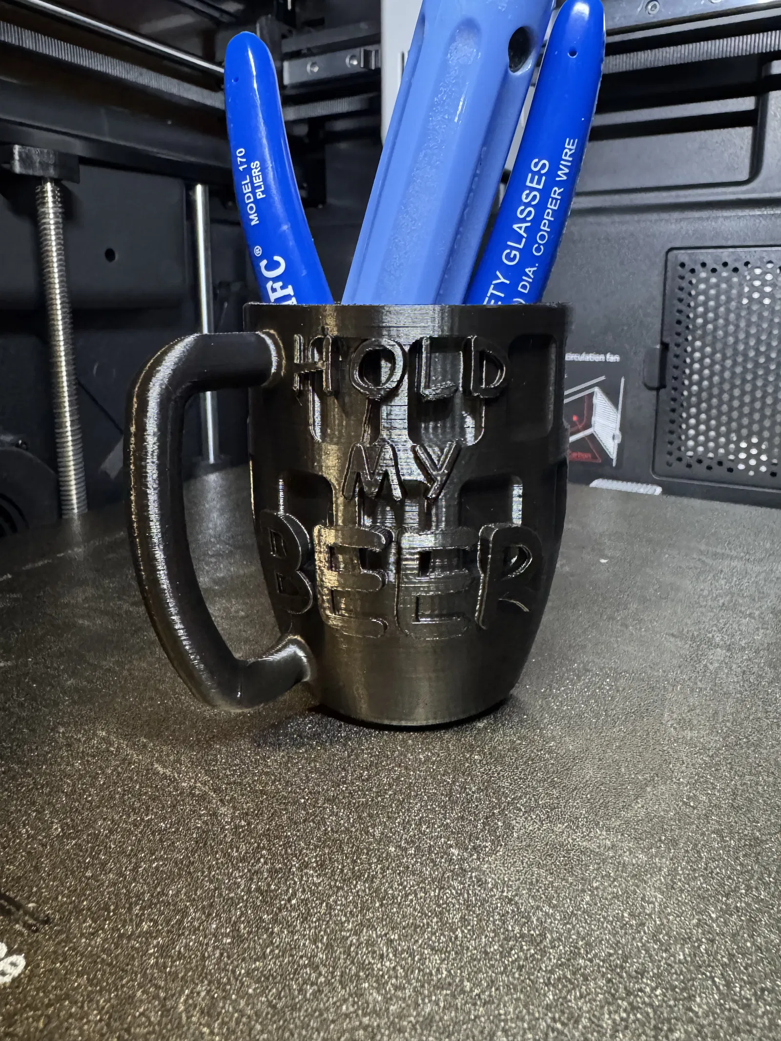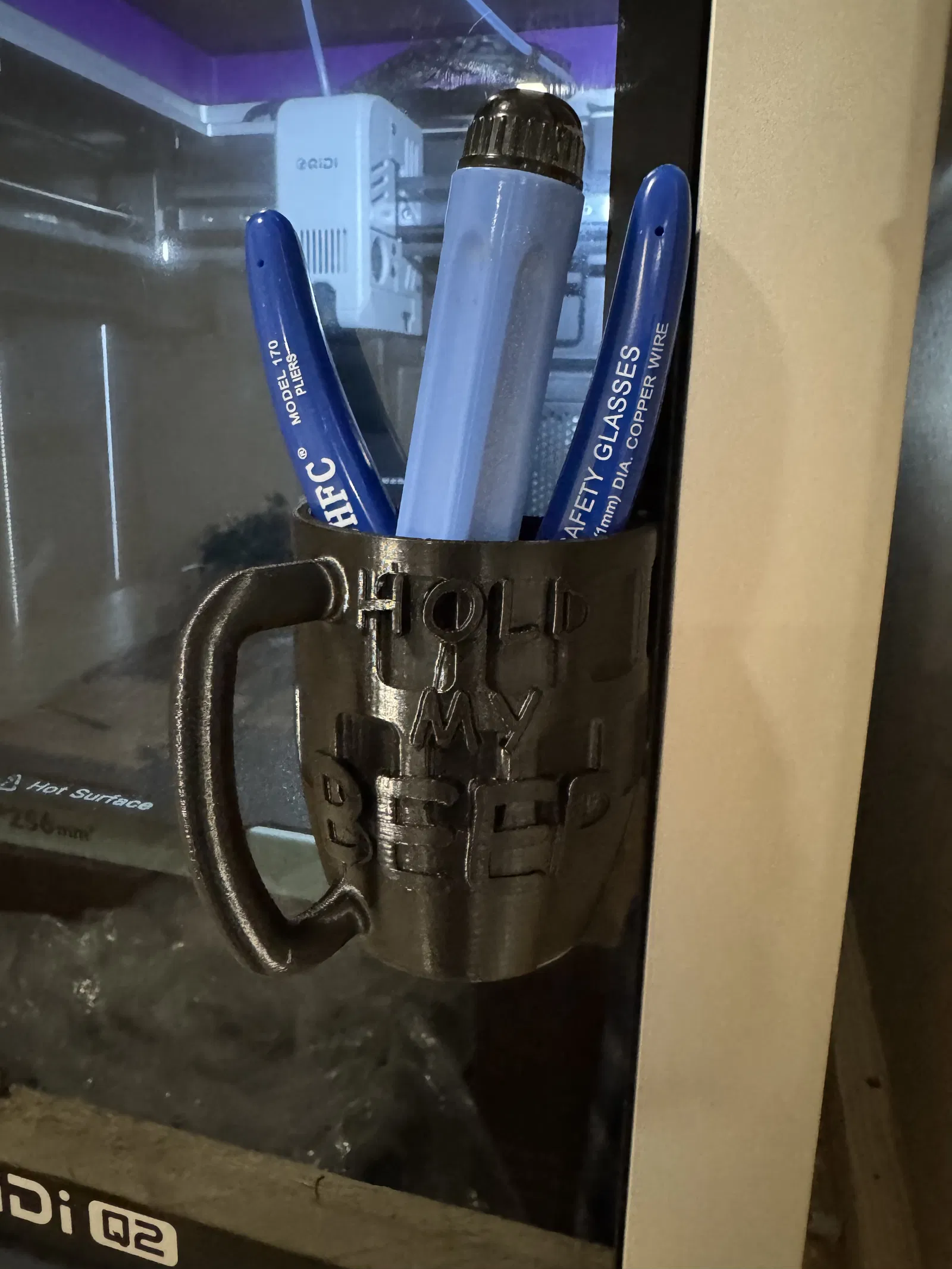 Tay nắm cửa “Hold My Beer” cho máy in Qidi Q2, thiết kế vui nhộn và tiện dụng. Có ngăn để kềm cắt (side cutter) và deburring tool bên trong. Khuyến nghị in upright với tree supports và brim.