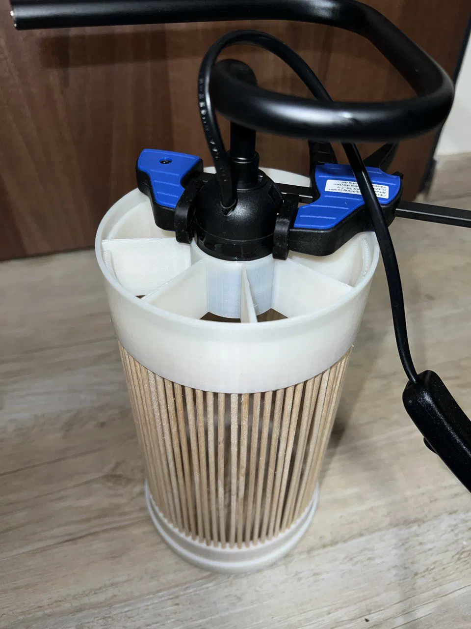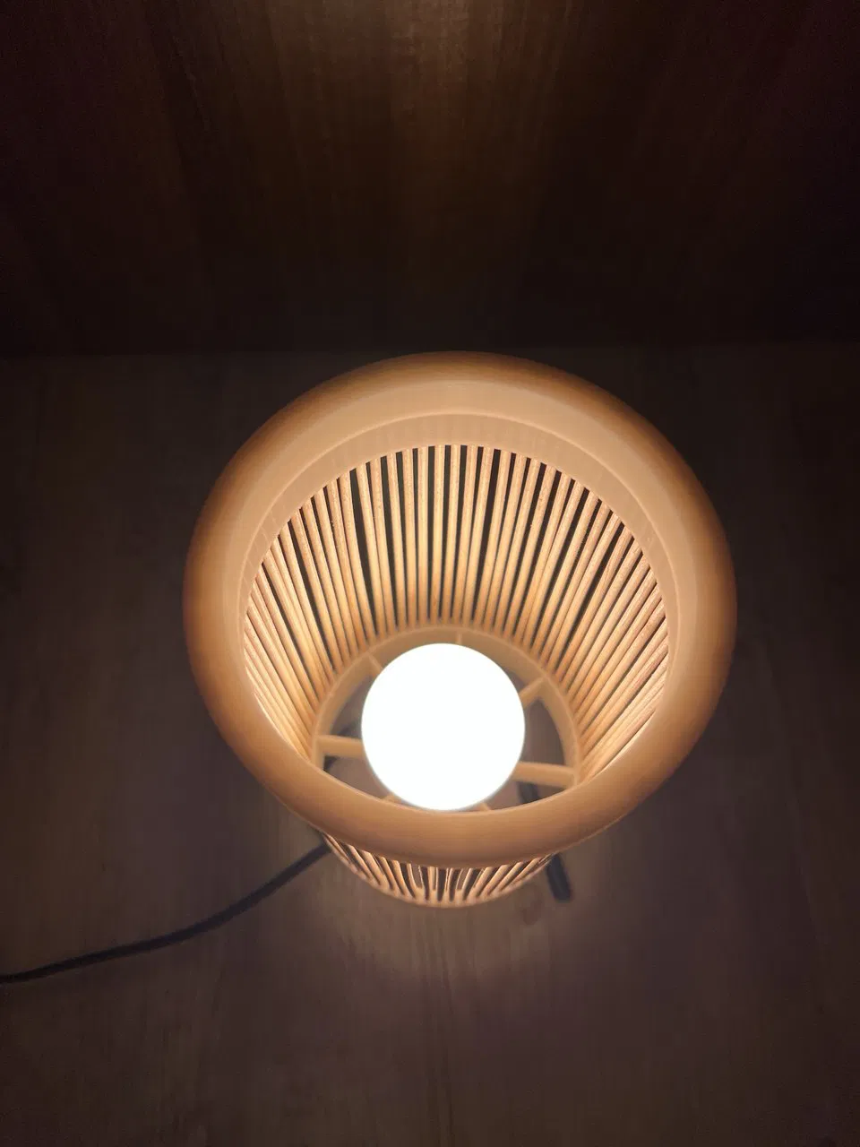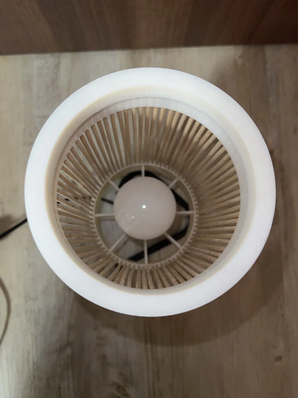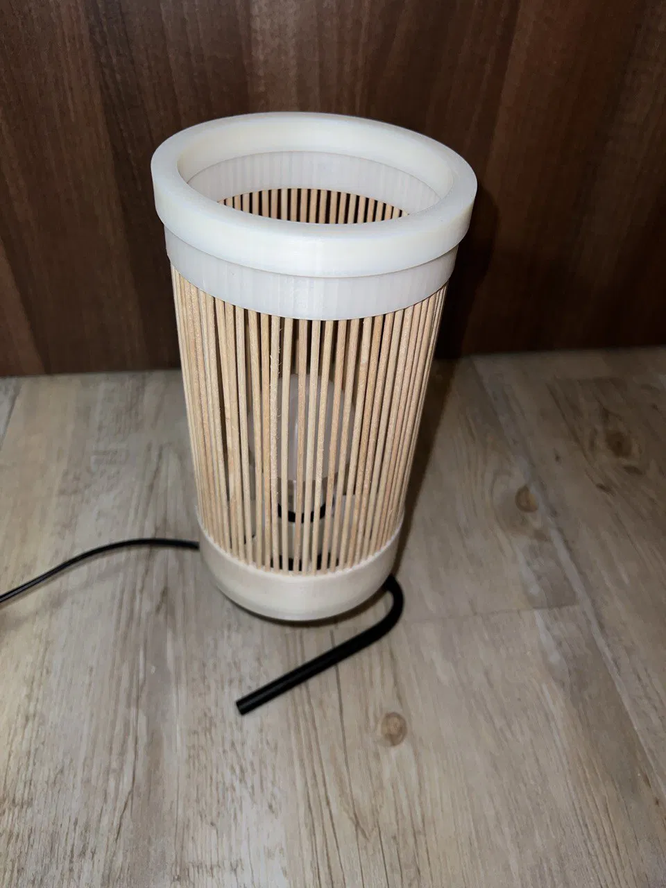 - Luồn các que xiên từ trên xuống qua “LampenschirmE27FassungDeckel.stl”, rồi cắm vào các lỗ của “LampenschirmE27Fassung.stl”