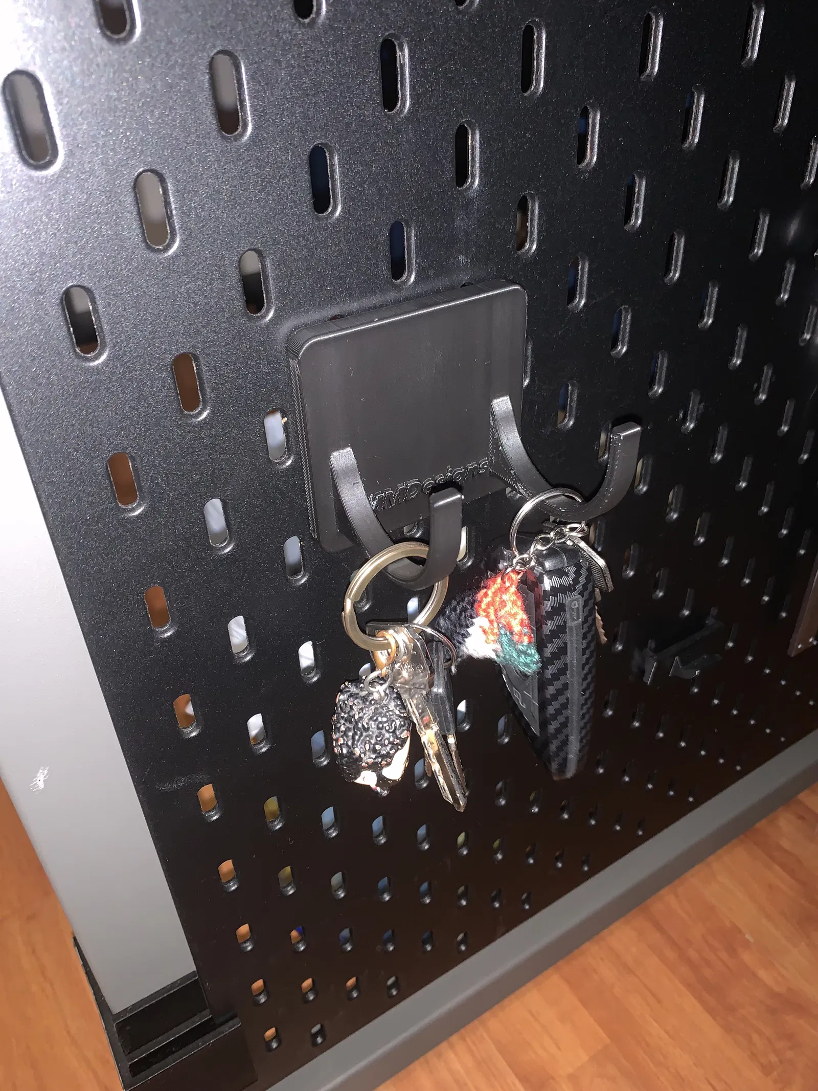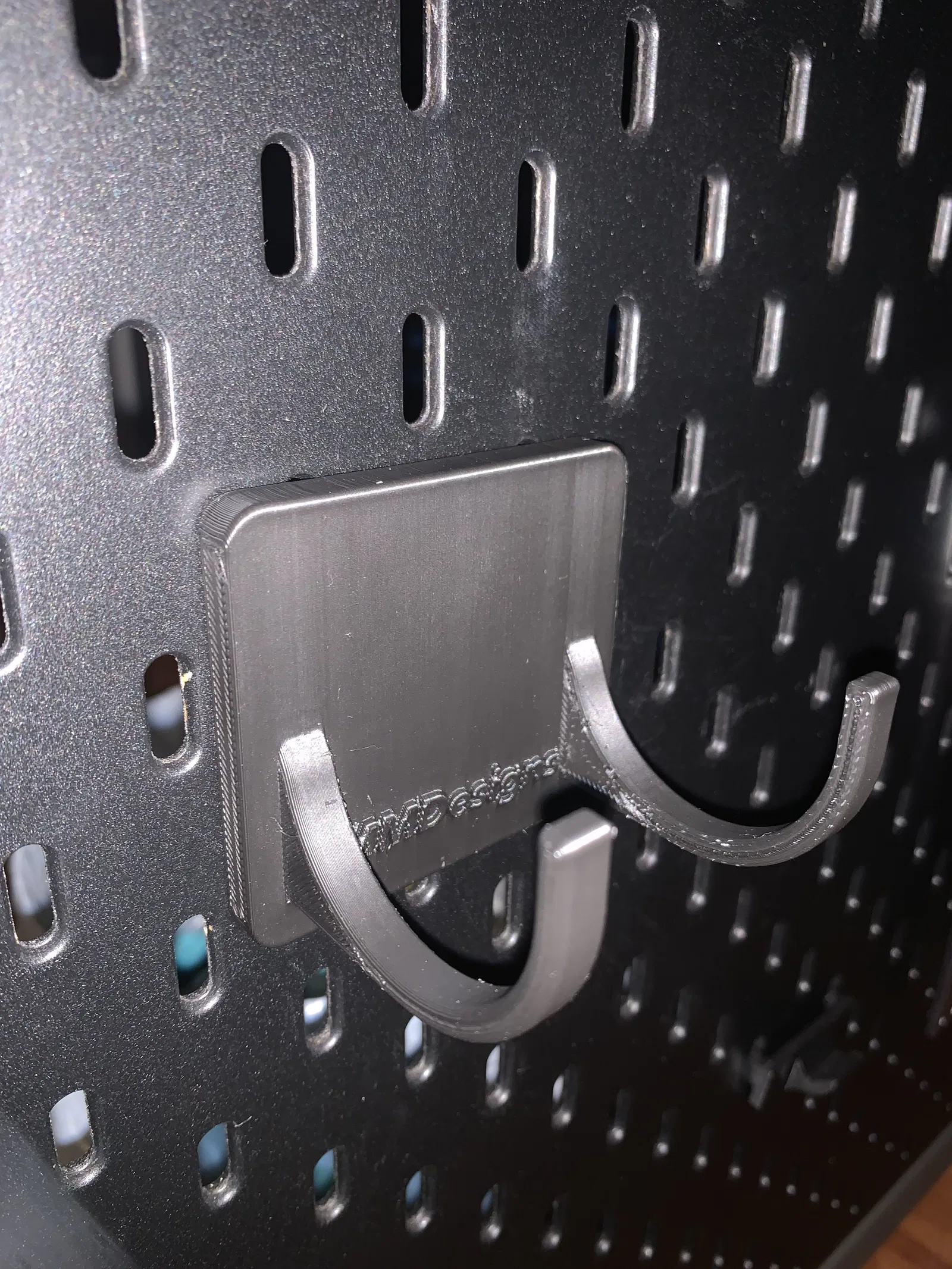 Mẫu móc đa năng cho Ikea Skadis pegboard, thiết kế từ đầu và dùng chốt peg theo chuẩn có sẵn để tích hợp vào model. In PLA trên Elegoo Neptune, gắn lên bảng rất khít và cực kỳ chắc.