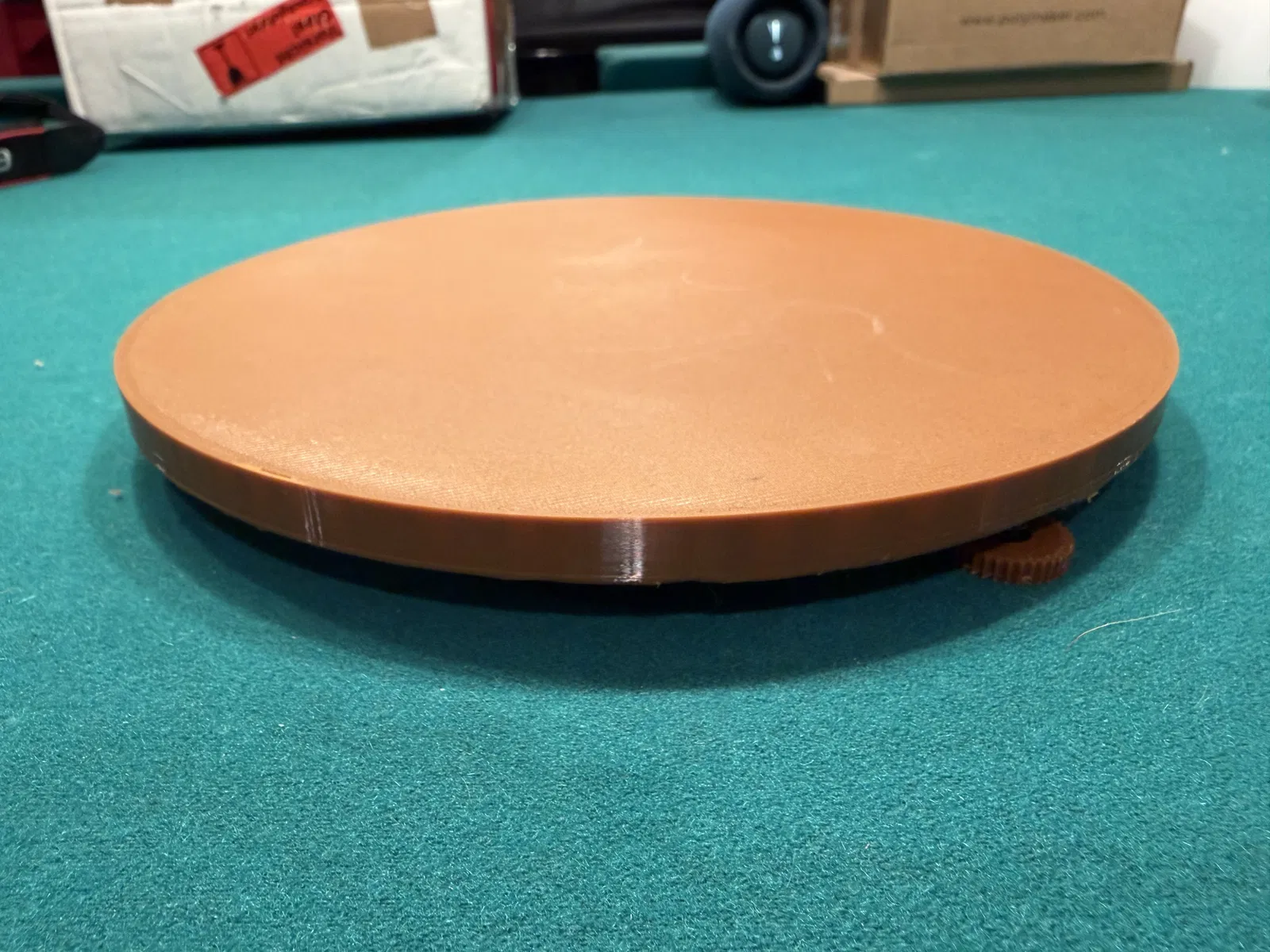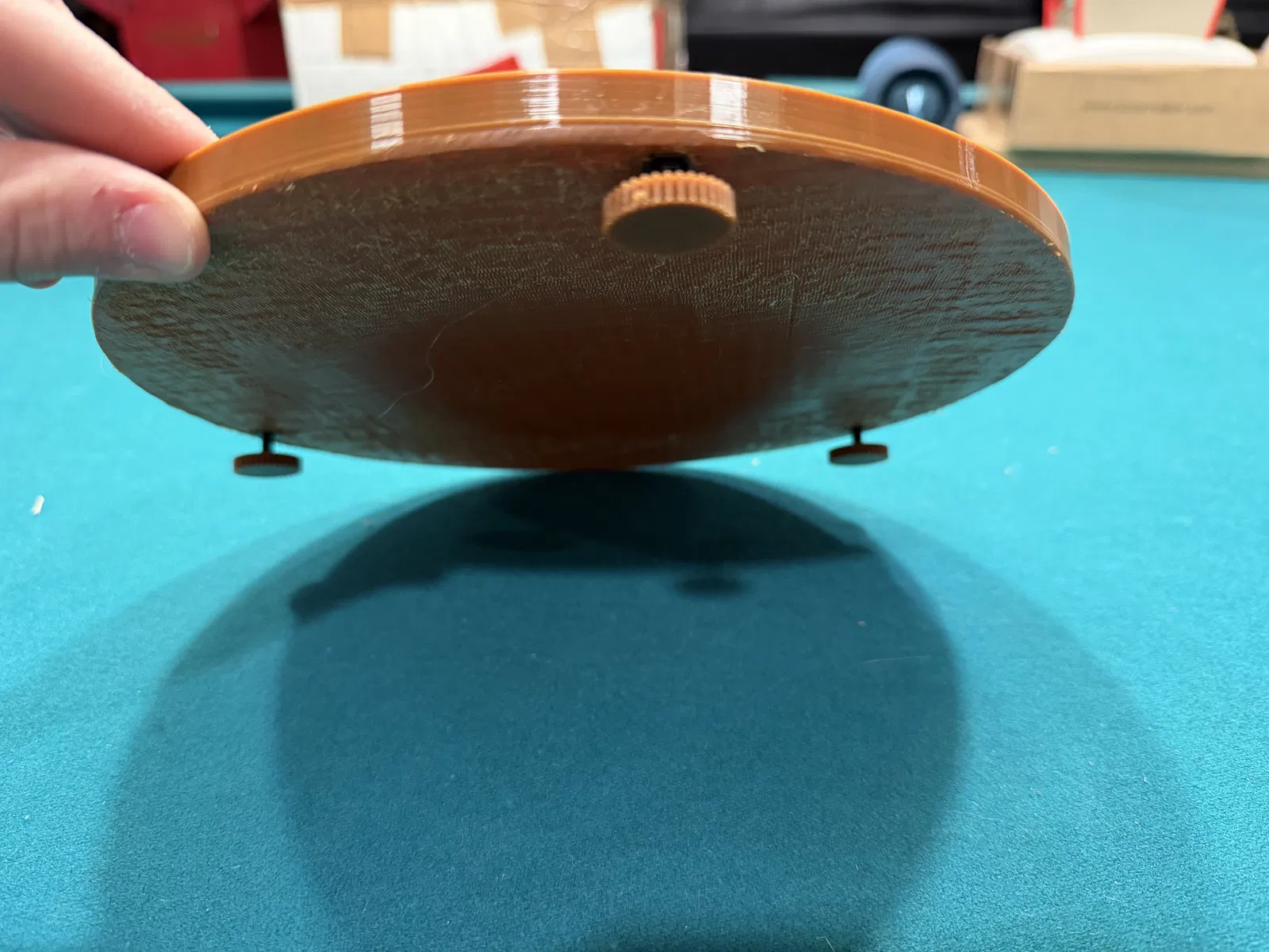 Sau khi in xong, ép các ê-cu M4 vào trong đế, rồi dán (glue) phần đầu dù của từng con ốc vào từng chân cân chỉnh (leveling feet).