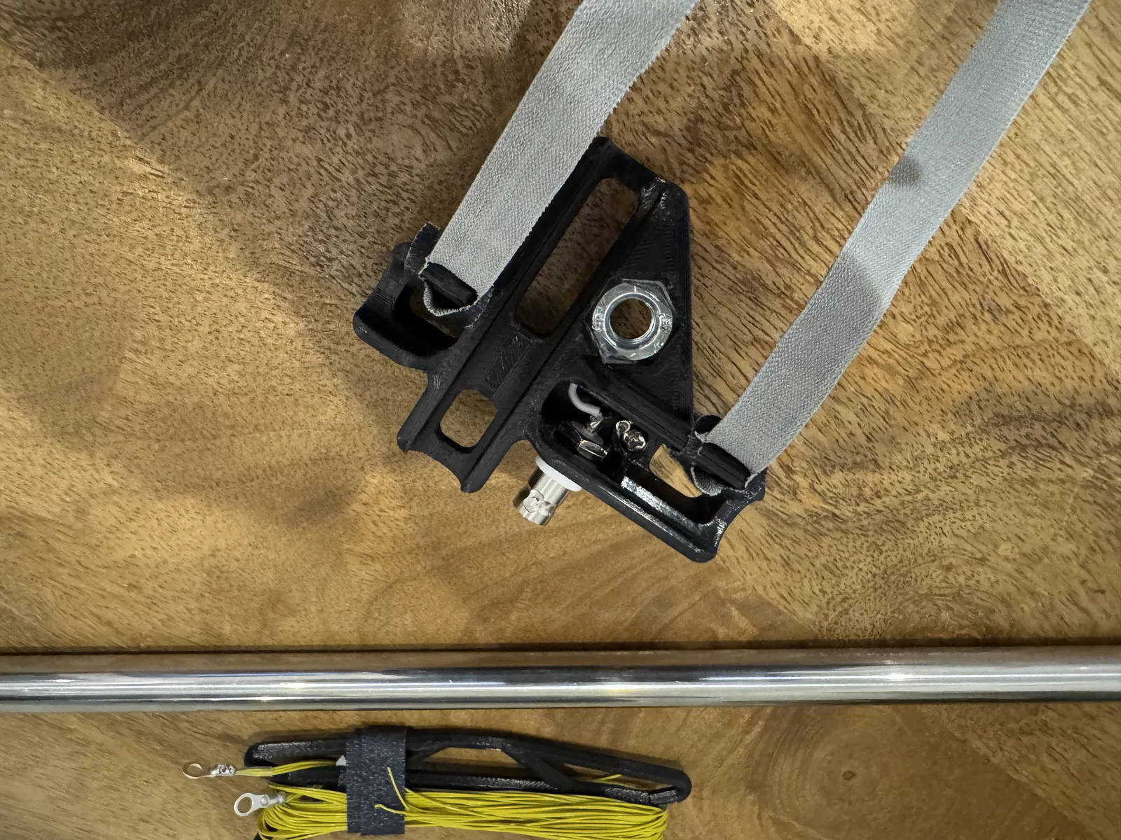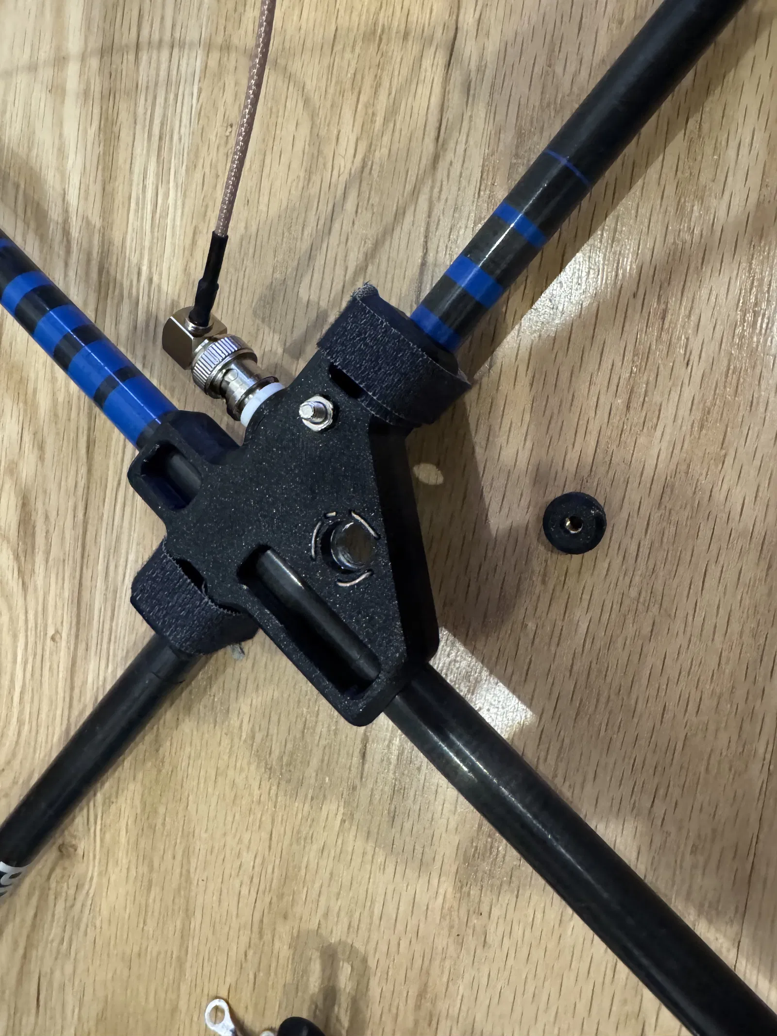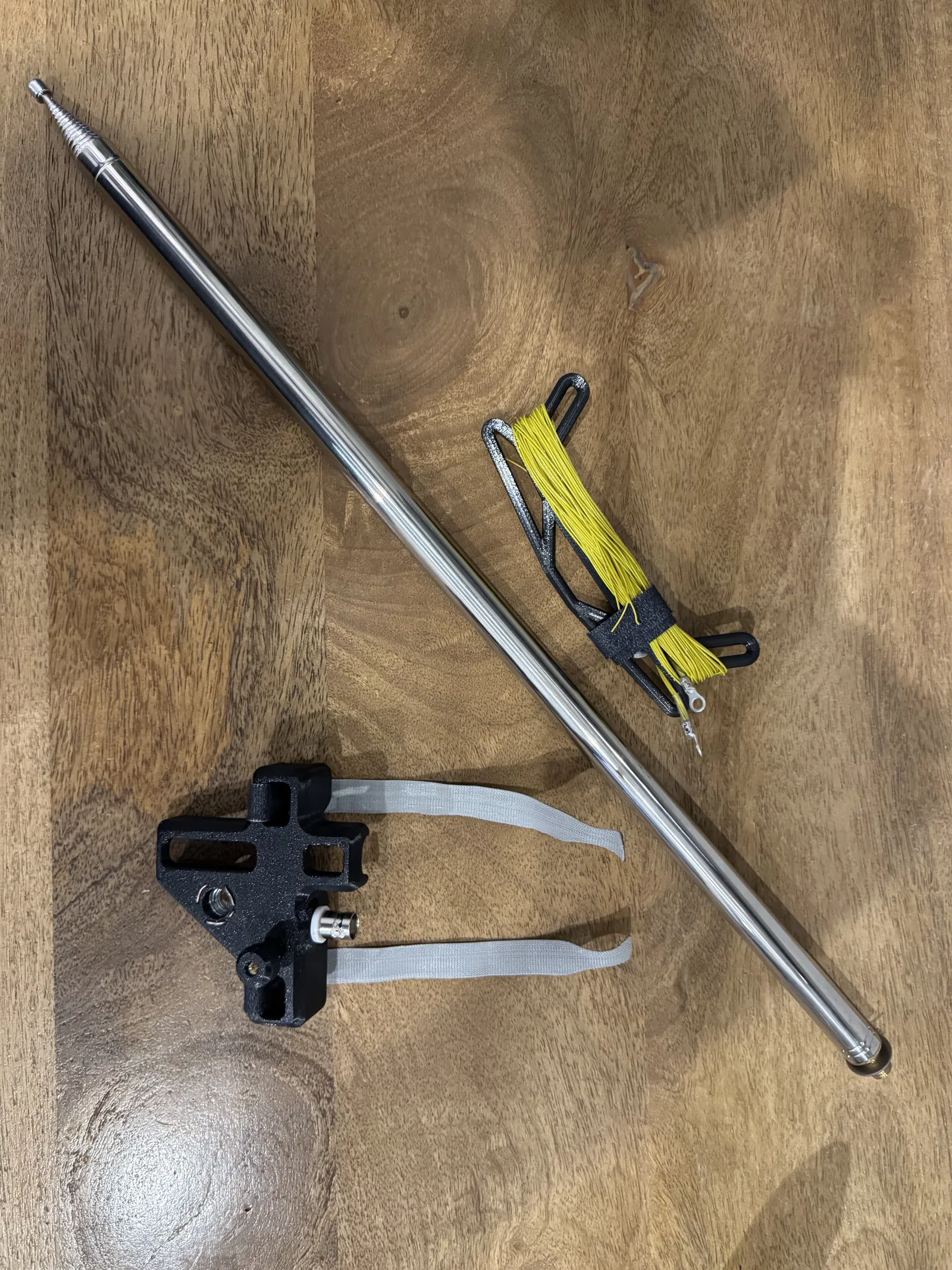 Dự án nhỏ gọn mà lại rất tiện: làm cái mount chắc chắn để dựng whip antenna nhanh, đứng vững trên đỉnh núi đá hoặc bất cứ chỗ nào. Ở phần đáy, bạn kẹp chéo 2 cây trekking pole (hoặc đại 2 cây que) rồi cố định bằng 2 sợi dây velcro.