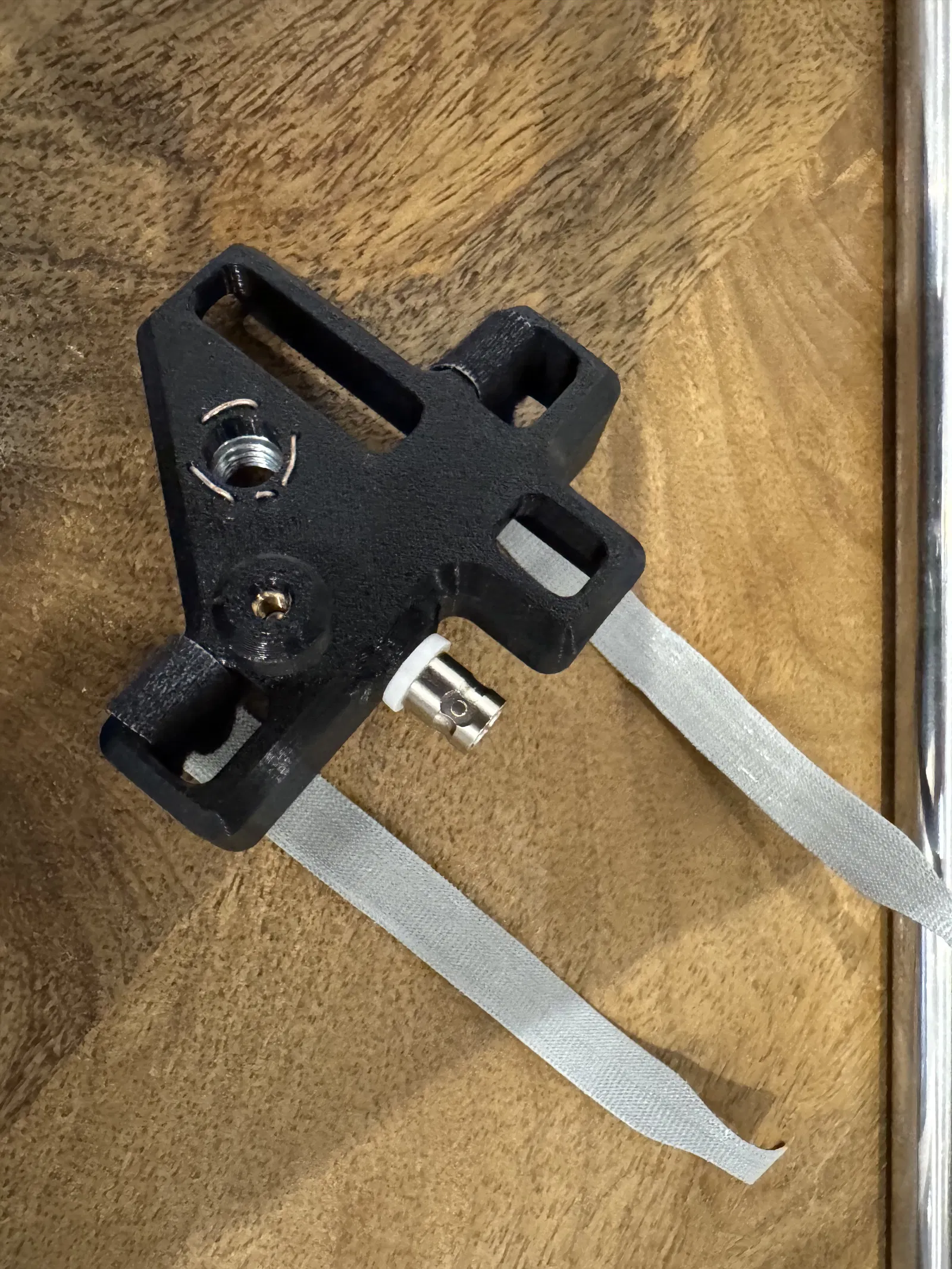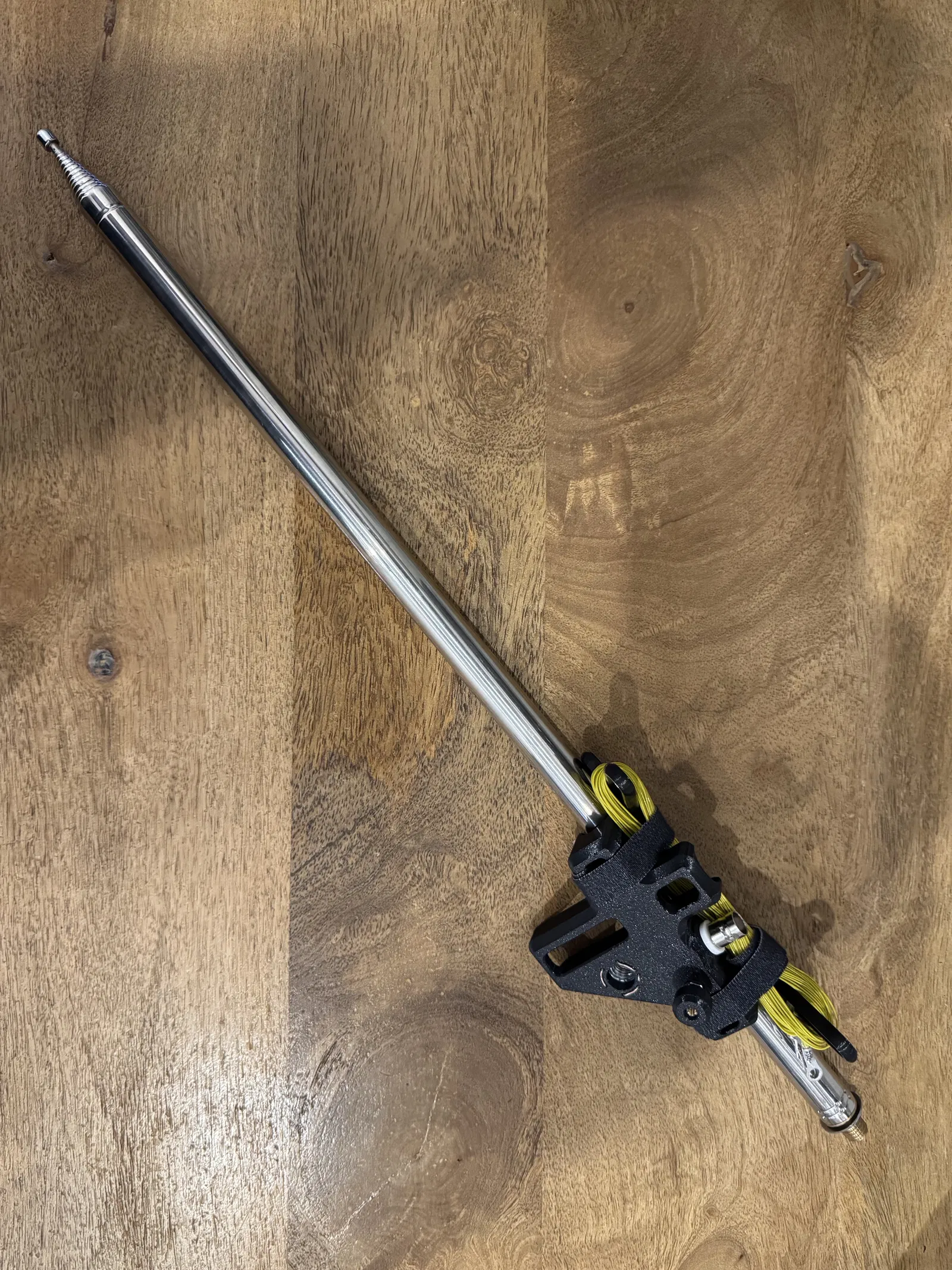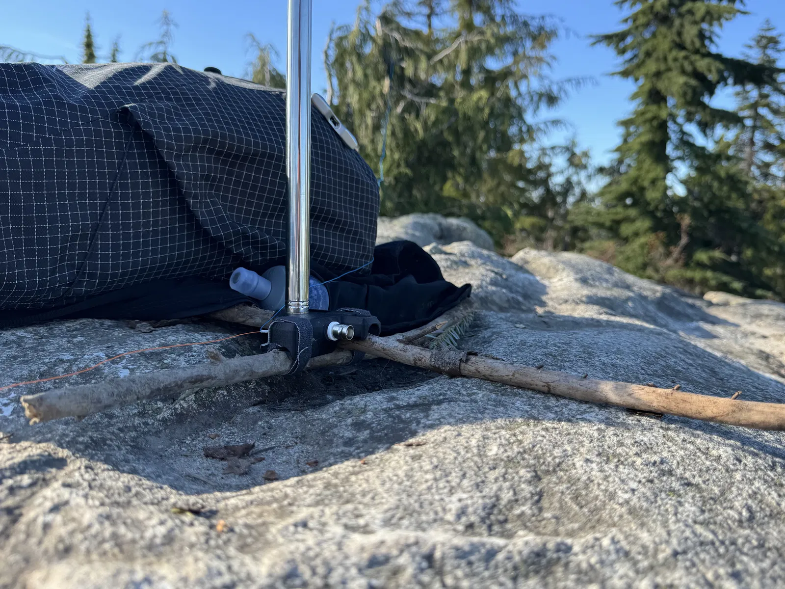 Dự án nhỏ gọn mà lại rất tiện: làm cái mount chắc chắn để dựng whip antenna nhanh, đứng vững trên đỉnh núi đá hoặc bất cứ chỗ nào. Ở phần đáy, bạn kẹp chéo 2 cây trekking pole (hoặc đại 2 cây que) rồi cố định bằng 2 sợi dây velcro.