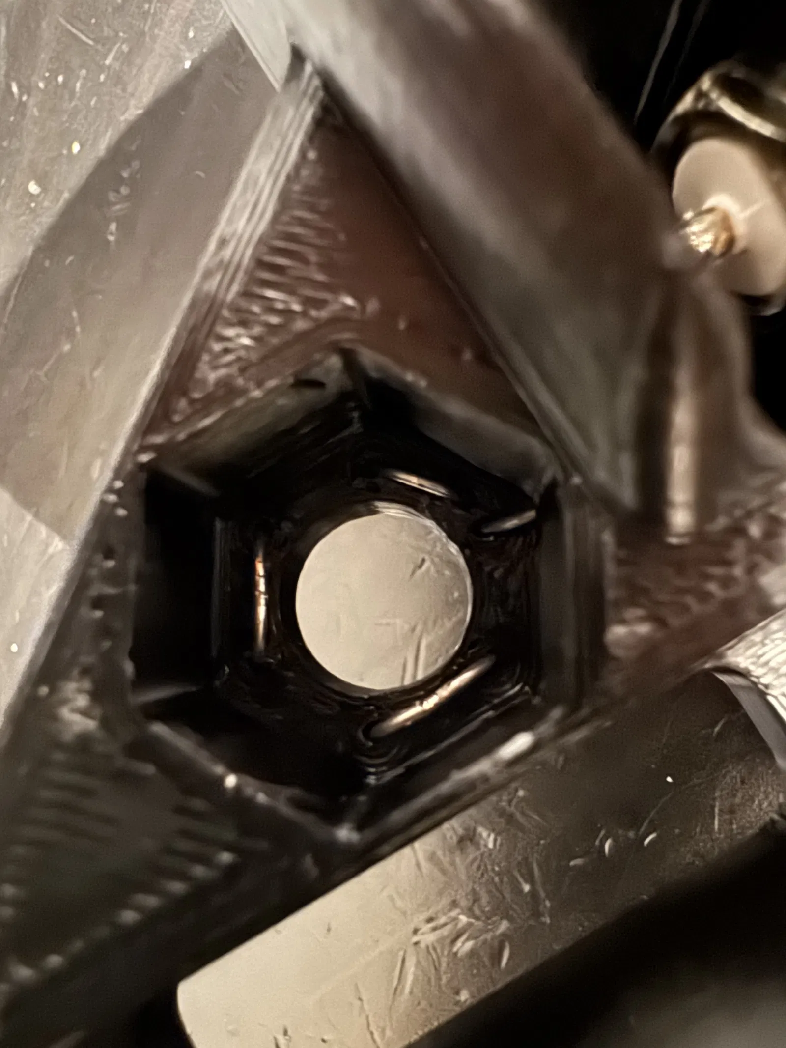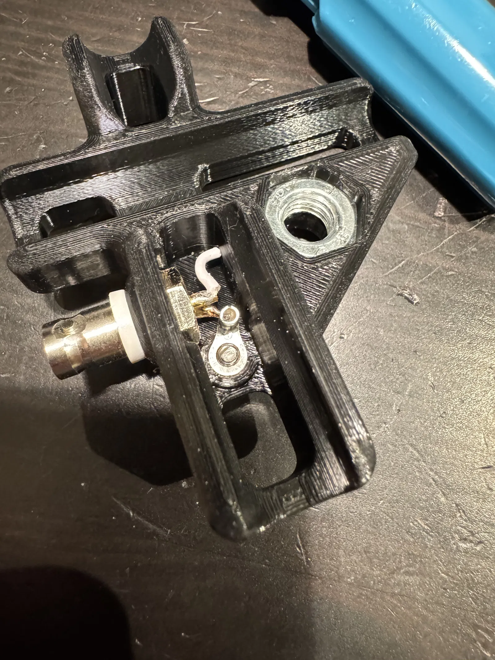 - Thả đai ốc M10 vào đúng vị trí và nhỏ vài giọt keo ở 2 góc ngoài là ổn. Epoxy 5 phút, epoxy thường, keo nến… tùy bạn. Thậm chí lấy mỏ hàn chấm nhẹ cho nhựa chảy ra (kèm ít mùi độc hại) cũng “được việc” luôn. :)