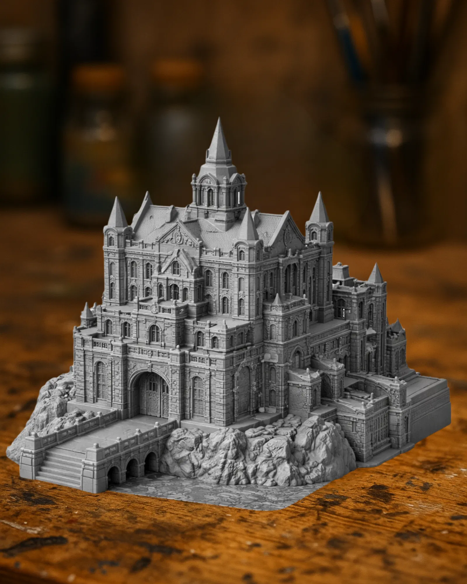 Mẫu diorama lâu đài Gothic siêu chi tiết đặt trên vách đá, nổi bật với vòm cong, tháp cao, cầu thang và các chi tiết kiến trúc trang trí tinh xảo. Rất hợp trưng bày, terrain tabletop và wargame.