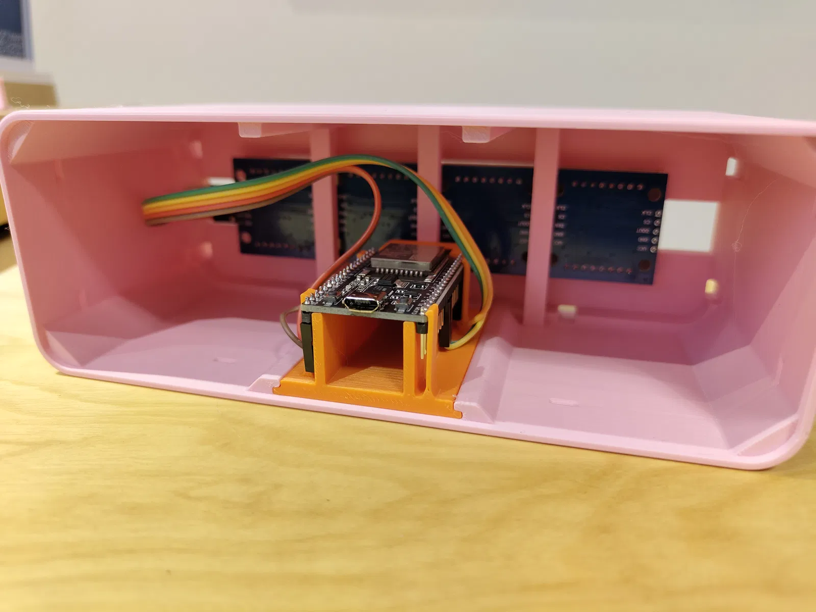Kết nối các dây đi từ module matrix vào bo ESP (sơ đồ chân phụ thuộc vào bo bạn dùng và cách bạn có thể tự cấu hình pin trong mã nguồn firmware) rồi bấm (snap-in) bo ESP vào holder.