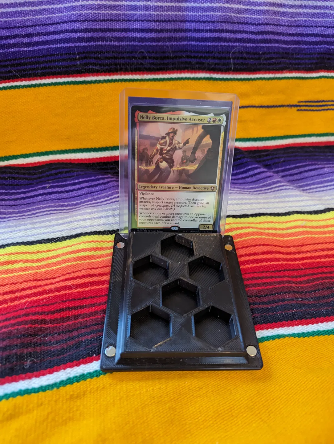 Hộp đựng bài đơn giản mà tiện dụng, có cửa sổ để trưng commander. Thiết kế riêng cho bộ EDH/Commander nhưng vẫn xài được cho bất kỳ TCG nào. Mình trước giờ không thích việc phải “nhét chặt” bộ commander double sleeved; nên mẫu này làm ra để chứa thoải mái 100+ lá đã double sleeve. Thực tế nó chứa dễ 100 lá double sleeved kèm thêm 10+ token, hoặc thậm chí cả bộ đếm máu đi kèm precon.