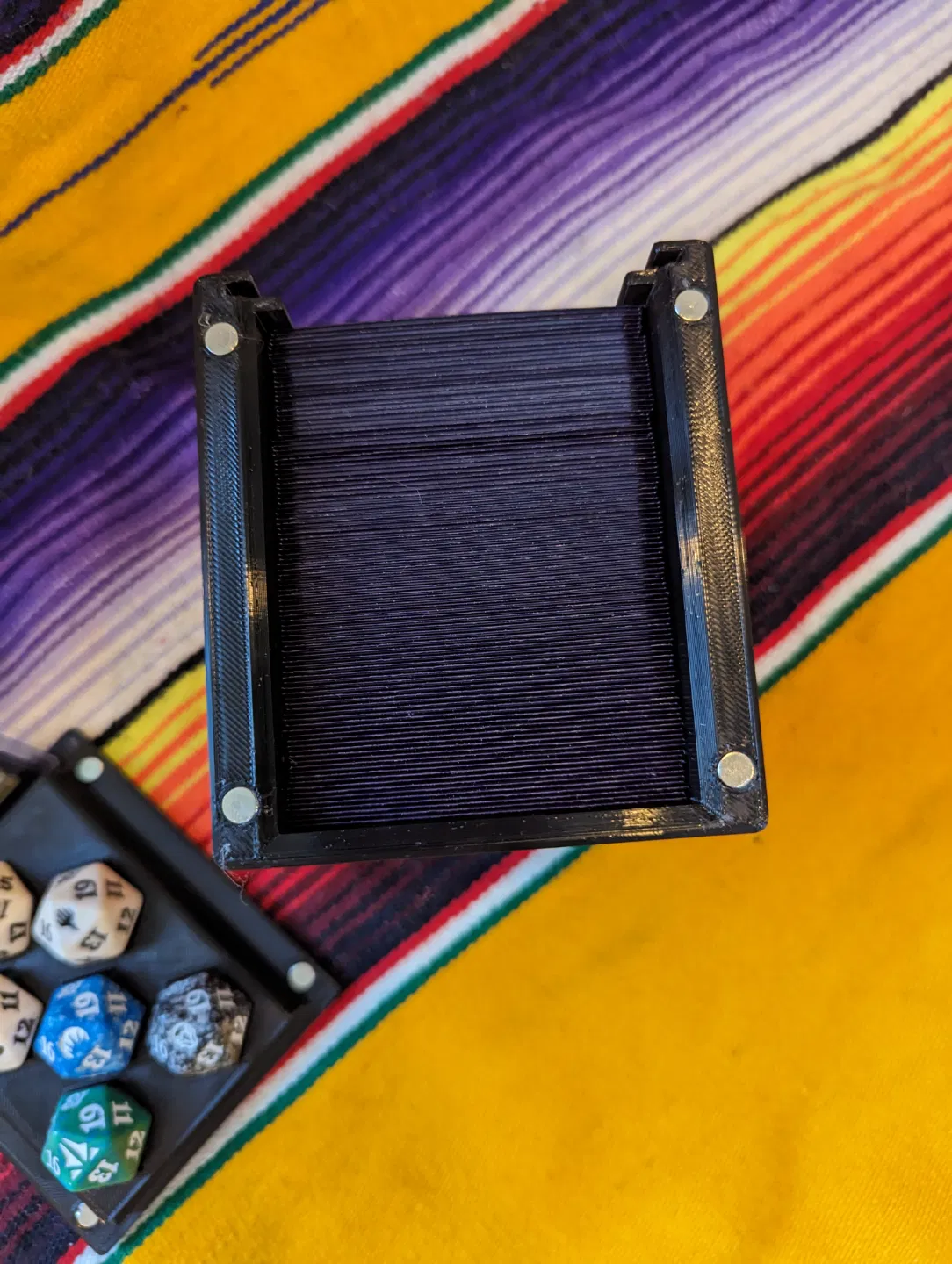 Nắp được thiết kế đặc biệt để đặt 6 viên xúc xắc D20 22mm khi chơi commander! Mình dùng 3 D20 spindown để theo dõi máu và 3 D20 spindown để theo dõi commander damage. Nắp còn có một gờ (lip) mà mình dùng làm command zone. Xúc xắc KHÔNG được cất bên trong hộp. Cái nắp chính là một command zone rất chuẩn!