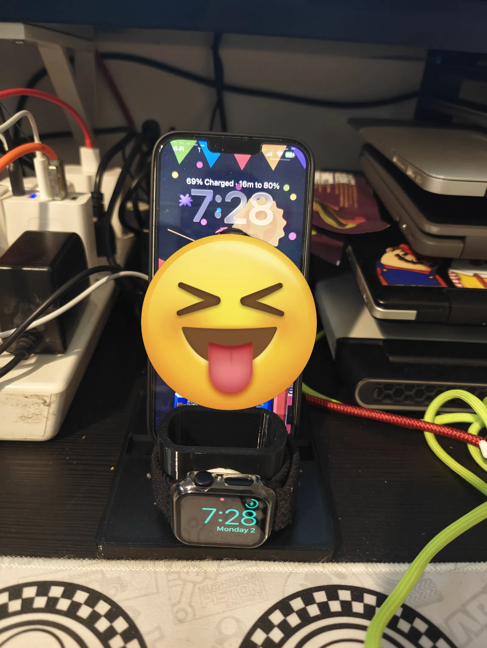 Mình cần một cái stand sạc iWatch gọn hơn và một cái stand iPhone dùng được sạc không dây Anker Qi2. Dây đi/giấu dưới phần đế.