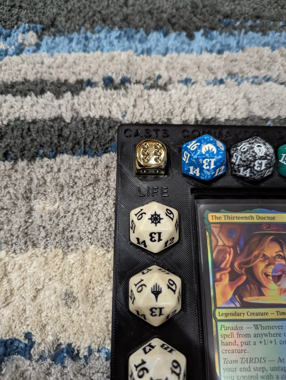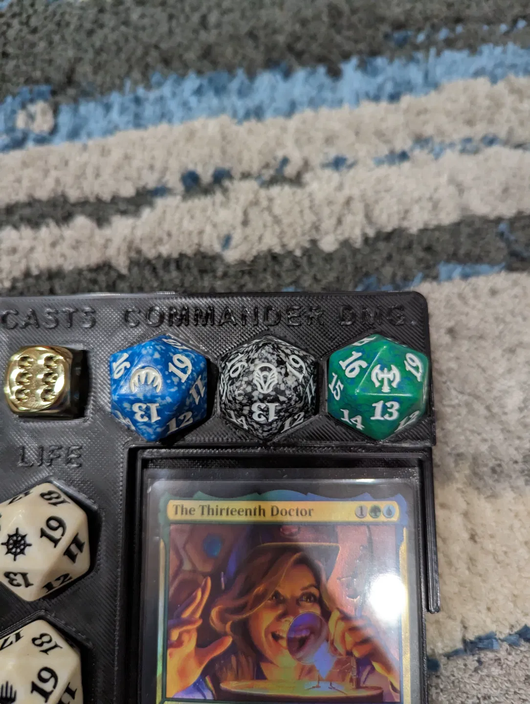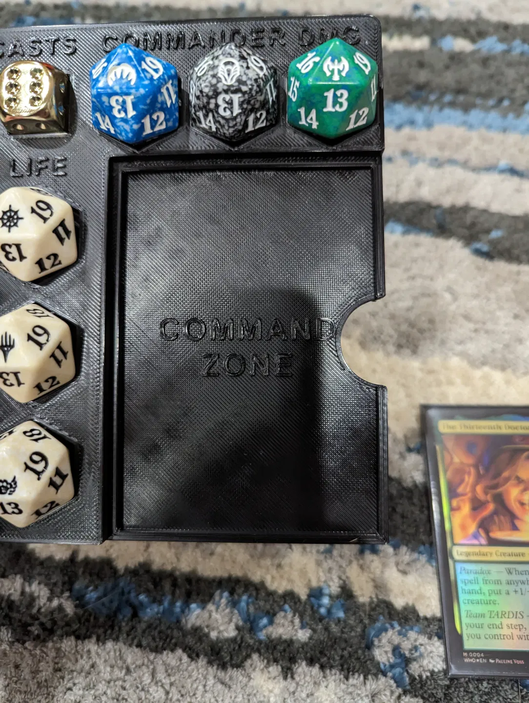 EDH Command Center giúp bạn theo dõi life, Commander Damage và số lần cast commander, kèm command zone vừa thẻ double sleeved. Hỗ trợ 3 D20 22 mm và 1 D6 16 mm; in multicolor sẽ làm chữ nổi bật hơn.
