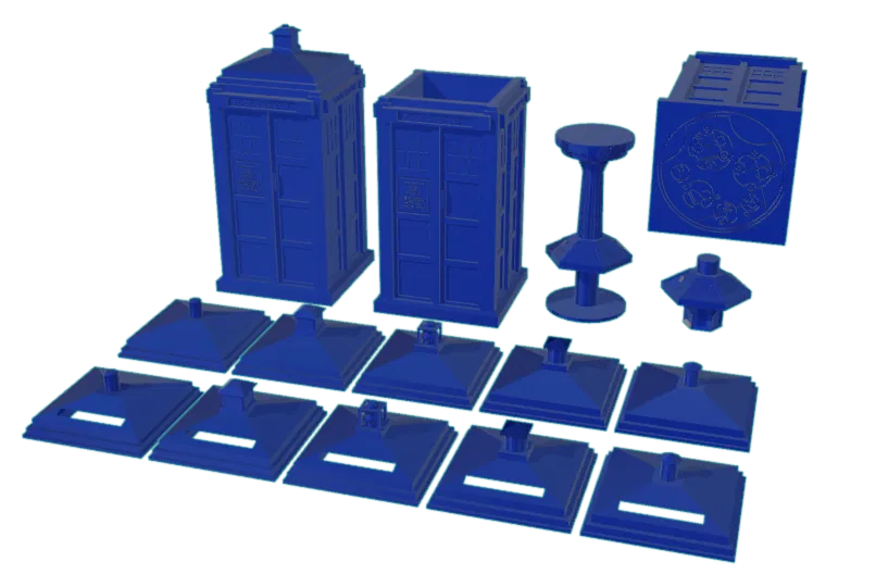 Mô hình 3D TARDIS Type 40 của Doctor Who: thân chính có roundels và đế khắc Gallifreyan, nhiều tùy chọn nóc/đèn theo từng Doctor, kèm 2 phiên bản Console. Cửa sổ thiết kế để xuyên sáng khi chiếu đèn từ trong.