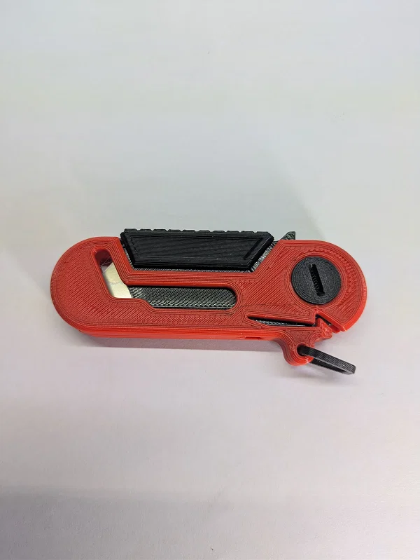 Mẫu Ring Pull Lock Blade Holder cho lưỡi 61×19 mm, kiểu dao gập cổ điển với khóa vòng kéo. In bằng PLA/PLA+ không cần support hay ốc vít; có thêm tùy chọn file hông mở và lực mở/đóng mạnh hơn.
