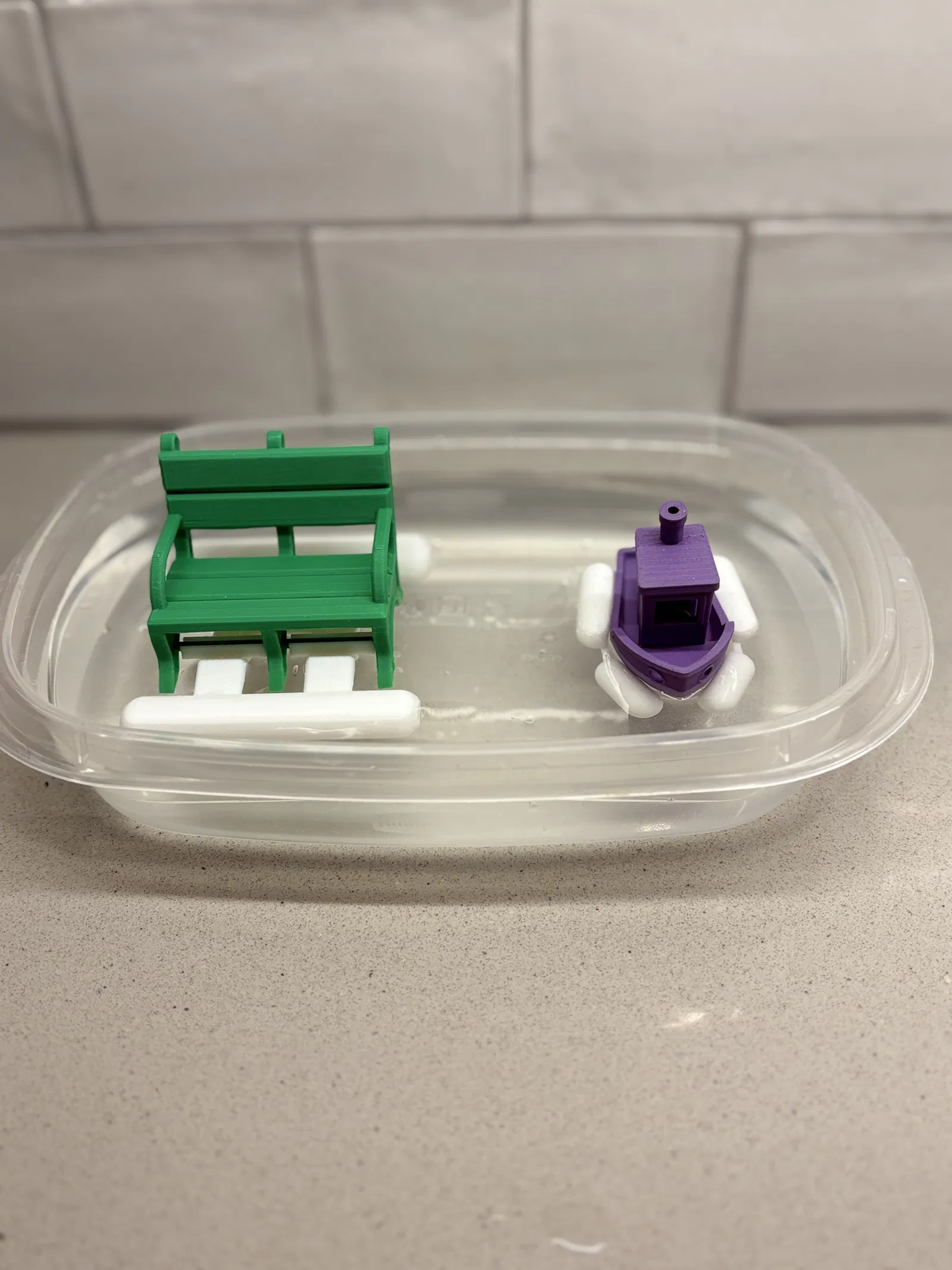 Dựa theo attachment “actually floating benchy” của Felix, mẫu Floating Boaty giúp Boaty nổi được thật. Khi lắp/đặt, phần đầu bench quay cùng hướng mũi tên; phao phía sau được làm lớn hơn để cân trọng lượng phần đuôi.