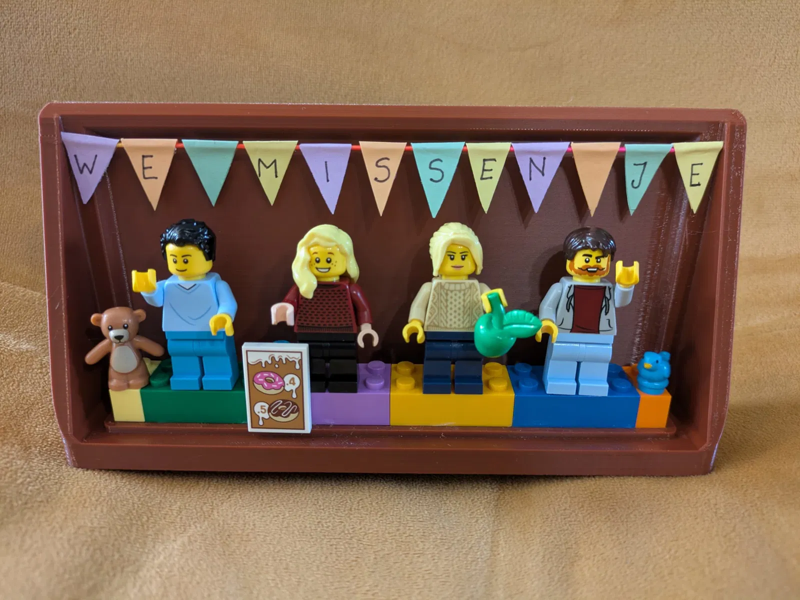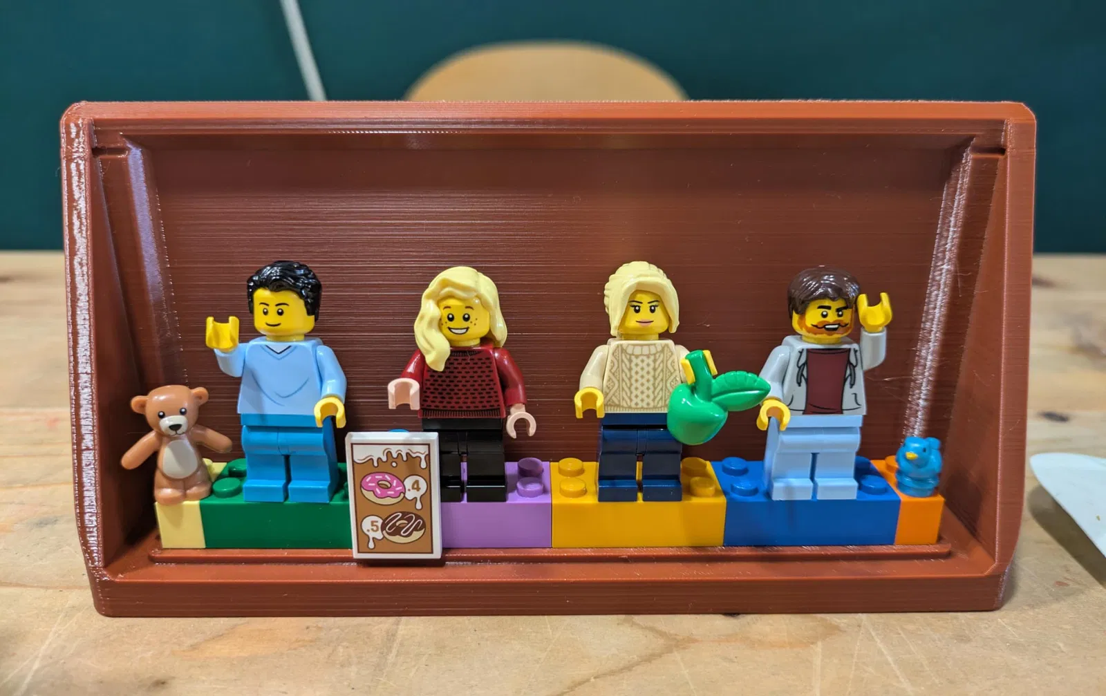 Vợ mình muốn cảm ơn cả team vì những khoảng thời gian vui vẻ họ đã có cùng nhau. Bả đã tạo nhân vật custom trên trang Lego cho tất cả đồng nghiệp. Sau đó bả nhờ mình làm một cái đế để đặt mấy nhân vật đó lên, nên mình thiết kế mẫu này. Bạn còn có thể gắn thêm một lá cờ ngang rồi viết lời nhắn lên đó nếu muốn.