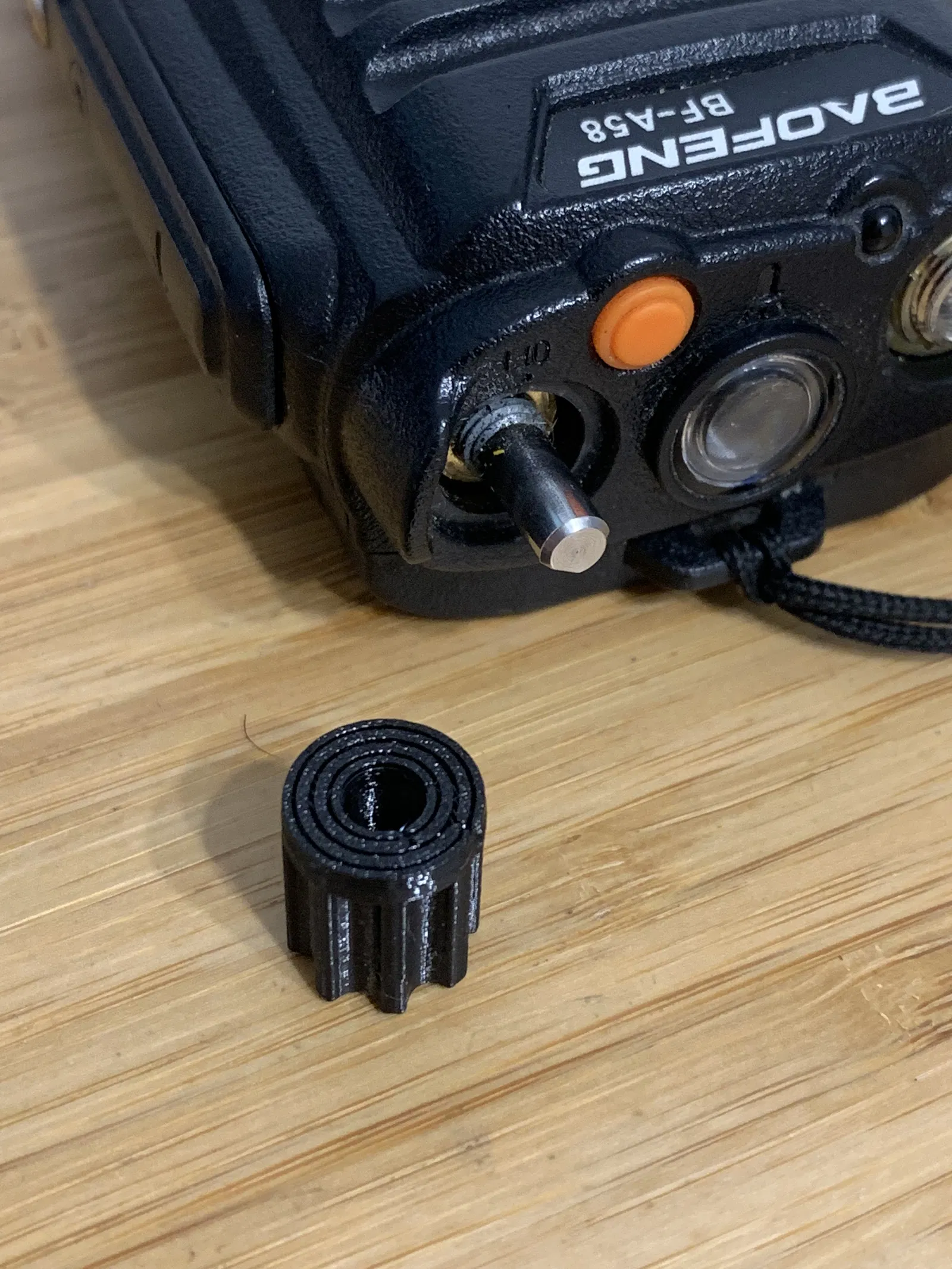Núm vặn âm lượng bám tay, in với 0% infill, dùng cho trục 4.7mm. Thiết kế cho Baofeng BF-A58 và UV-5R. Bạn thử với máy của mình rồi đăng hình/nhận xét giúp nha.