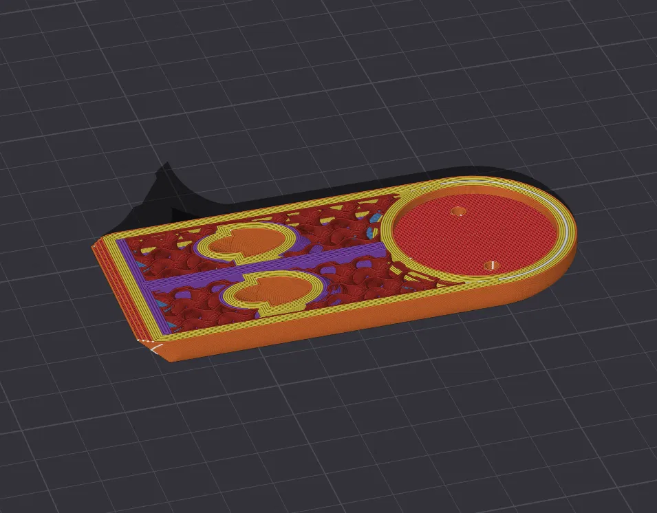 Mình in bằng PETG và thêm một phần tăng độ cứng (tuỳ chọn) ở giữa, chạy xuyên suốt chi tiết. Xem hình chụp màn hình. Không cần support structure.