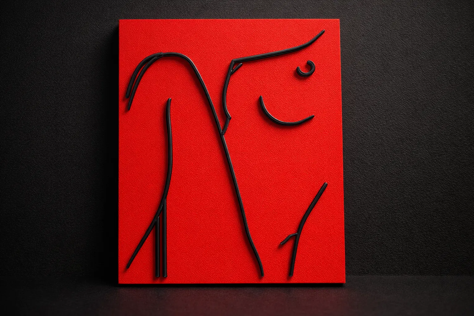 Tấm panel treo tường in 3D phong cách tối giản với các đường line nổi màu đen, tạo bóng đổ sâu và tổng thể sạch, hiện đại. Gợi ý in bằng PLA+ hoặc PETG, infill Gyroid 15–20%.