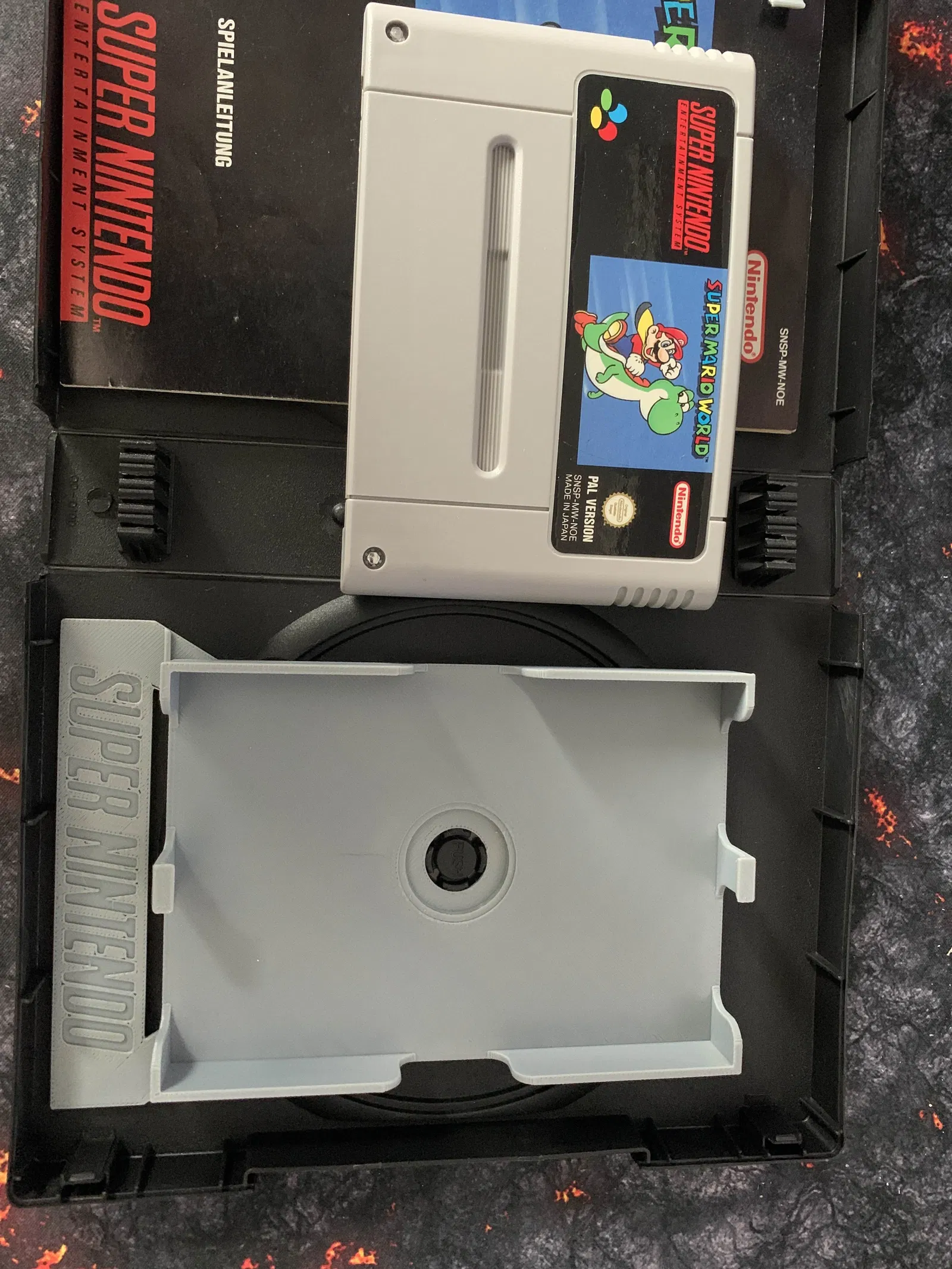 Bộ chuyển để biến hộp DVD lưng 32mm thành hộp đựng băng PAL Super Nintendo (SNES). Chỉ cần in adapter và tray, bấm vào hộp DVD là vừa khít, không cần sửa hộp; đủ chỗ cho inlay, băng game và manual.