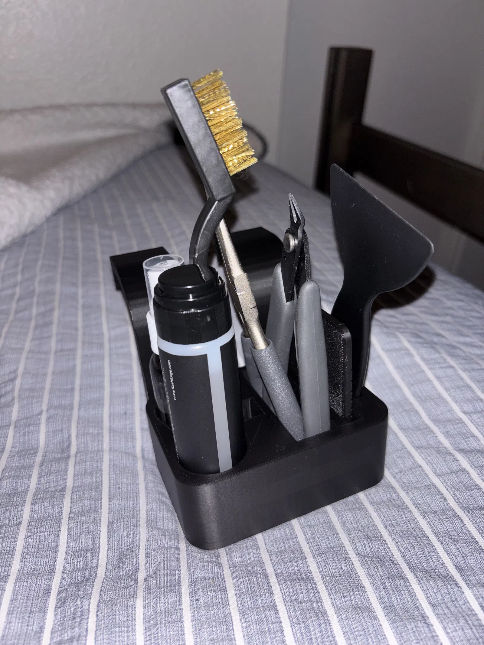 Mình làm giỏ này để đựng keo dán (adhesive stick) của FlashForge, một chai xịt IPA đường kính khoảng 30mm, bàn chải sắt, kềm cắt/kềm (snips/plyers), thước đo filament cho cuộn (filament gauge for spool) và cây nạo (scraper) của FlashForge.