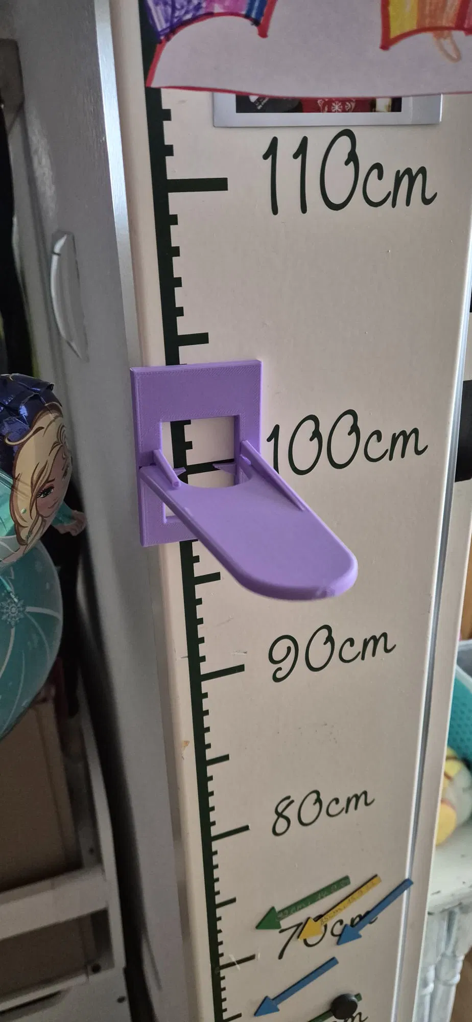 Dụng cụ hỗ trợ đo chiều cao cho bé (stadiometer) giúp đo chuẩn hơn. Bản remix có thêm lỗ để gắn nam châm 6x2 cho khung cửa kim loại; nên dán keo để cố định. In bằng PLA.