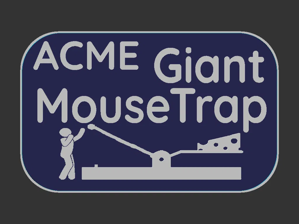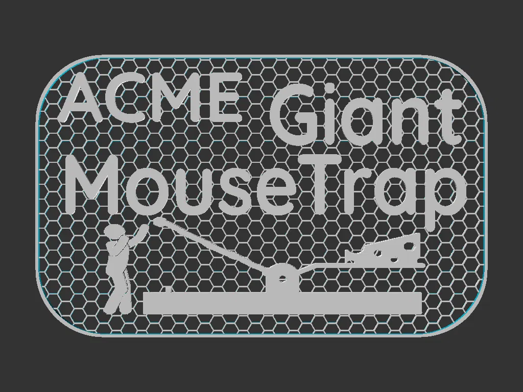Bảng hiệu 100x160mm chủ đề ACME Giant Mouse Trap (mồi không kèm). Có file Mesh và Solid, tối ưu khi chuyển màu (color switch) trên 1mm như gcode mẫu. Phù hợp để trưng trong Shadowbox Frames.
