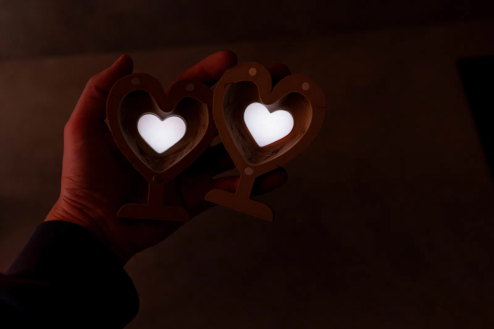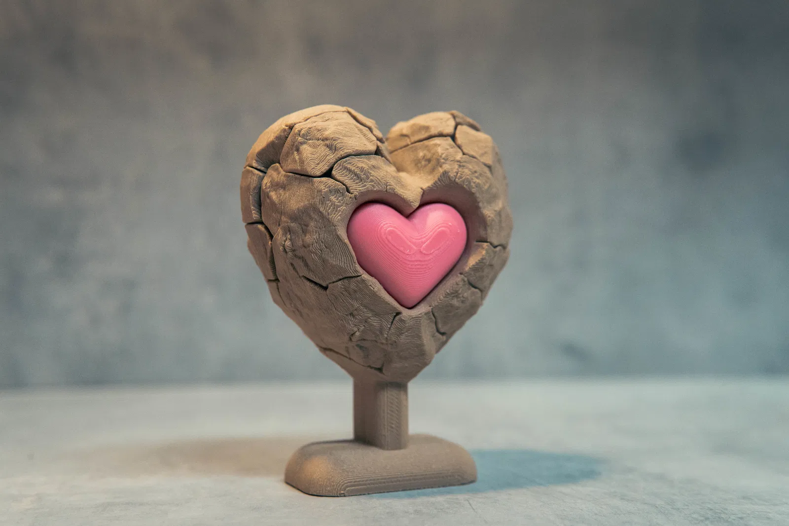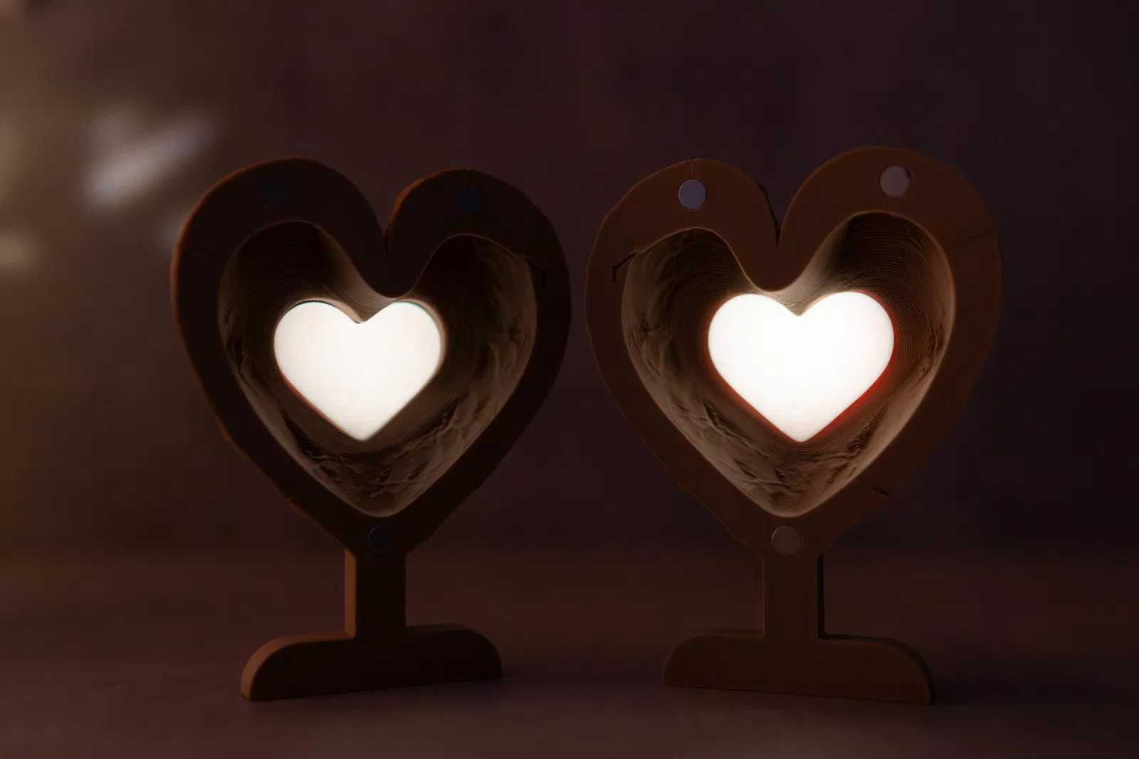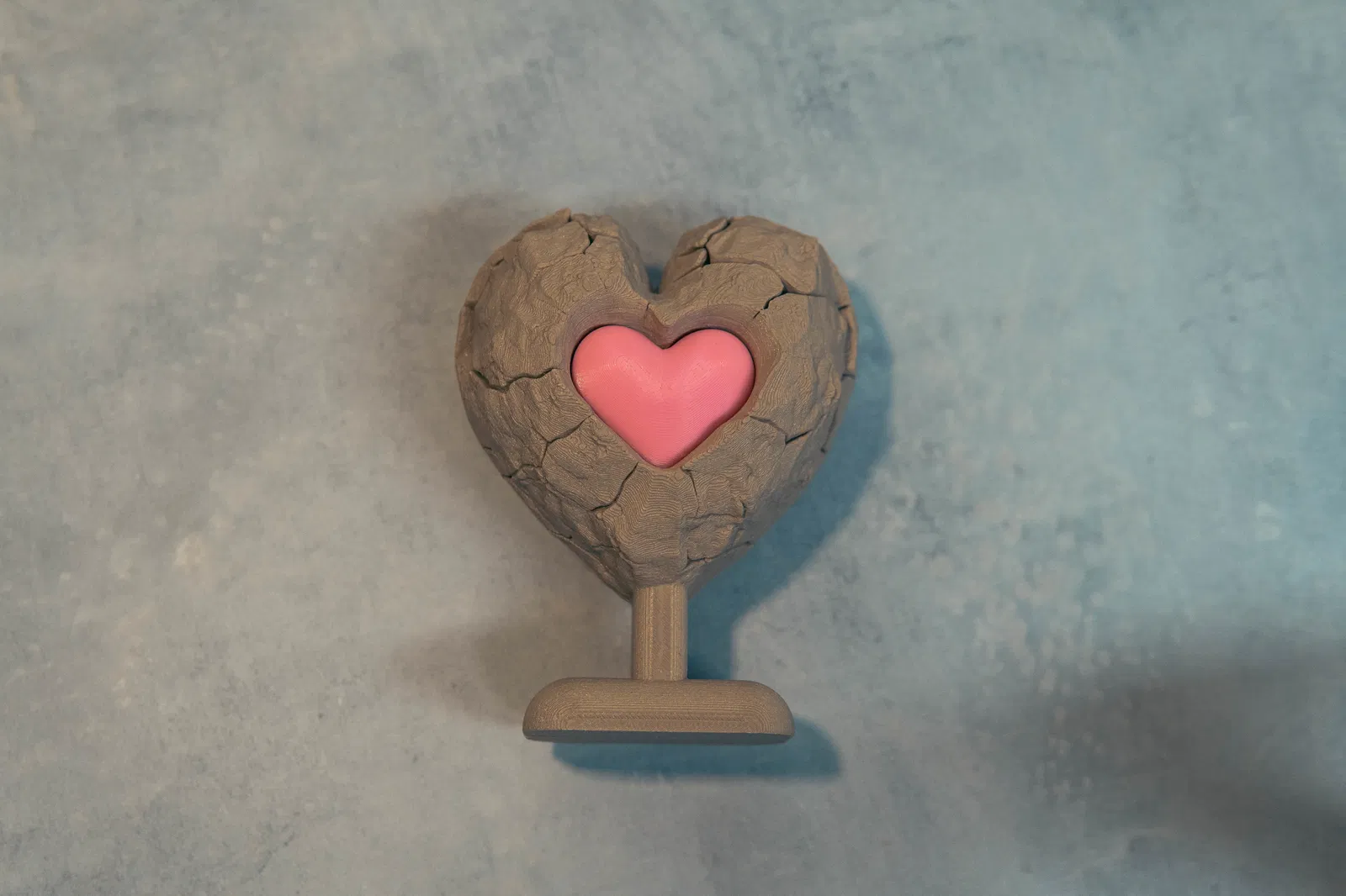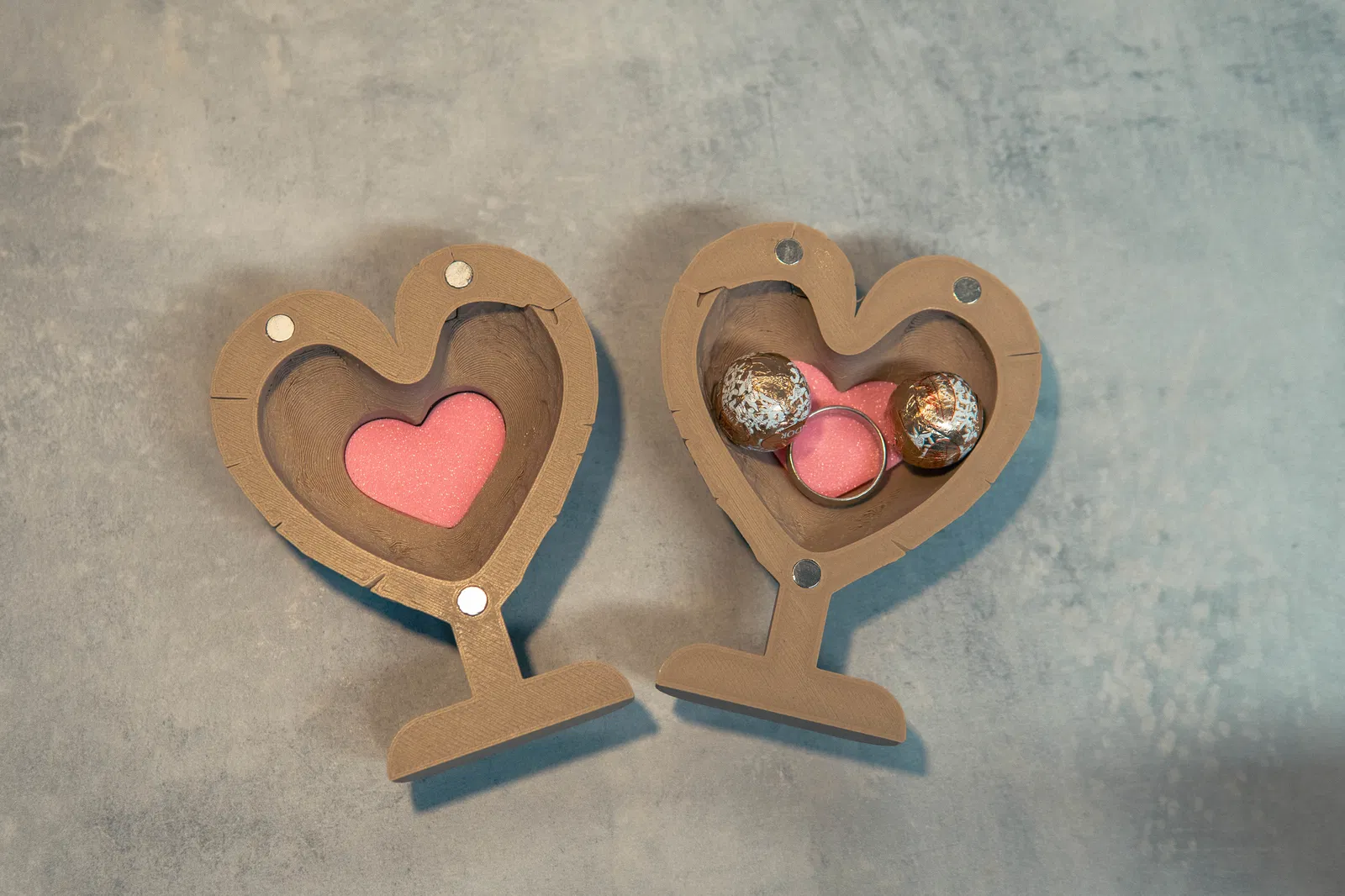 Hộp quà hình trái tim gắn nam châm, bề mặt matte kiểu đất sét và có bệ trưng. Mở ra thành 2 nửa, lộ lõi tim màu hồng in bằng glow filament. Bên trong vừa cho nhẫn, socola hay kỷ vật—rất hợp Valentine, kỷ niệm.
