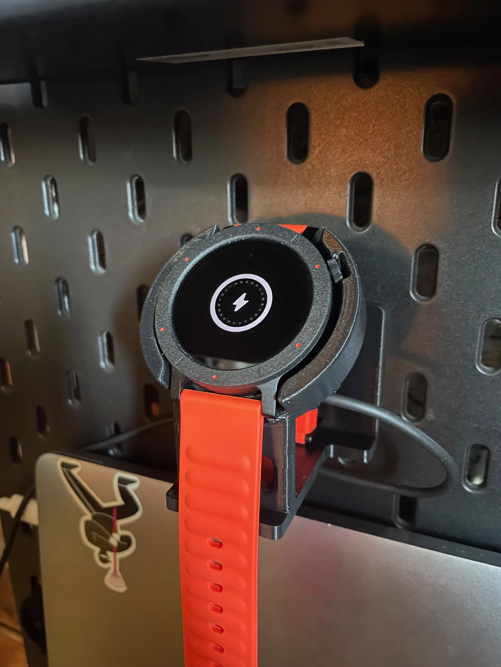 Remix dock sạc cho CMF Watch 3 Pro, tích hợp ngàm gắn pegboard IKEA SKADIS. Giữ nguyên fillet radii và hình học của mẫu gốc để đồng nhất thẩm mỹ/kết cấu, chỉ gia cường khi cần cho treo tường.