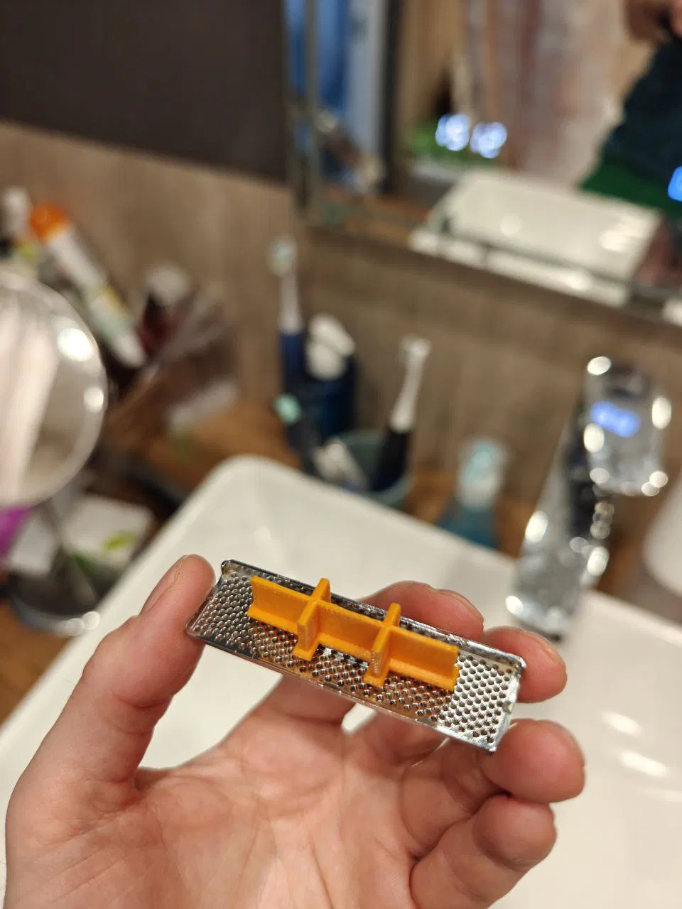 Giá giữ nắp che lỗ tràn cho Jacob Delafon ETA073-CP. Bản zin có thể bị rớt lọt xuống lỗ thoát nước (đã từng xảy ra), còn thiết kế này giúp giữ chắc, không bị lọt xuống.
