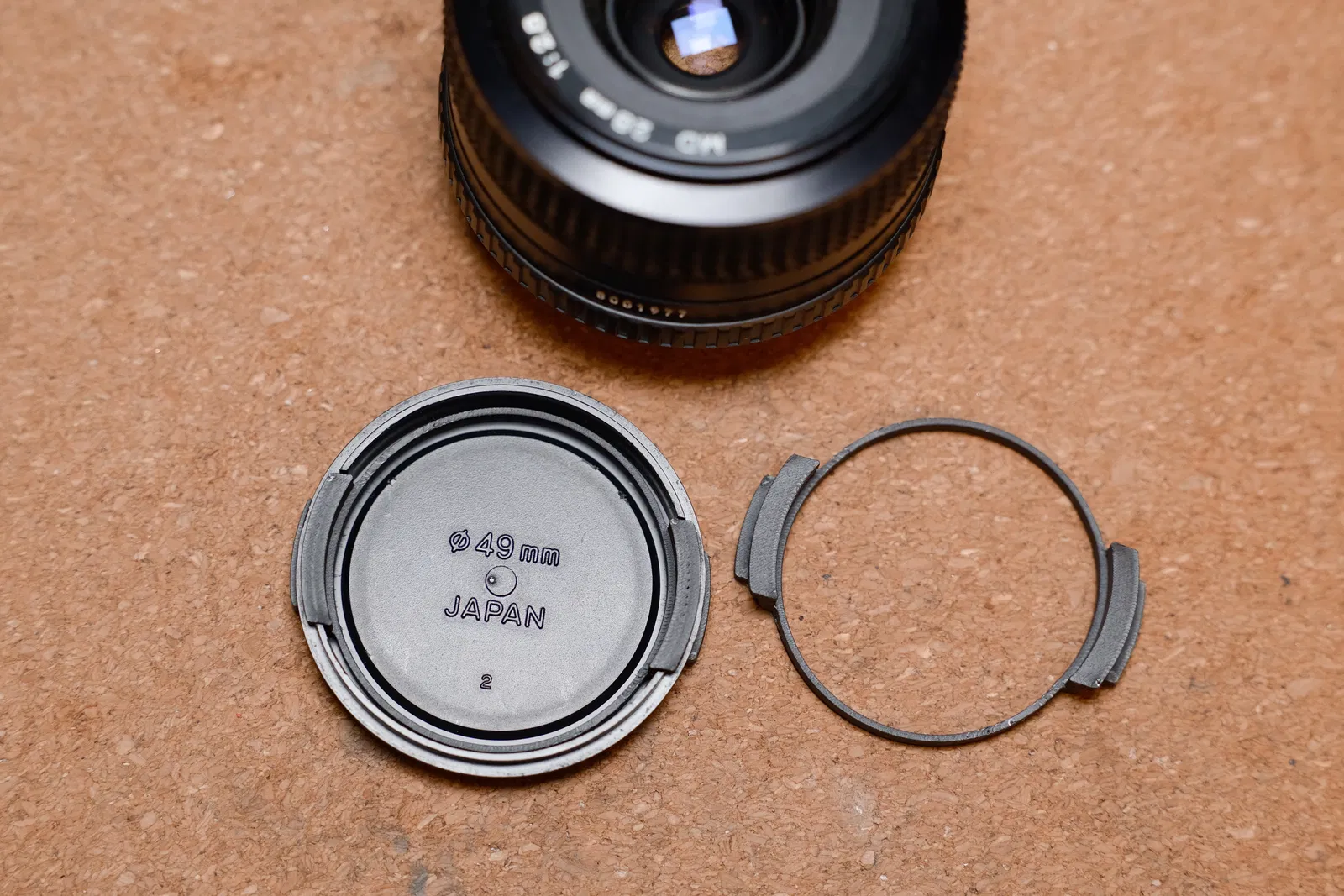 Đây là đồ thay thế cho cái phần (không biết gọi chính xác là gì) nằm bên trong mấy nắp lens Minolta đời sau này. Cái nắp này lấy từ ống MD-mount 28mm f/2.8 thời X-700, và phần nhựa có lò xo thì hư đúng kiểu “đến hẹn lại lên”. Nắp này cỡ 49mm; bạn cũng có thể thử scale part này để hợp với các nắp kích cỡ khác.