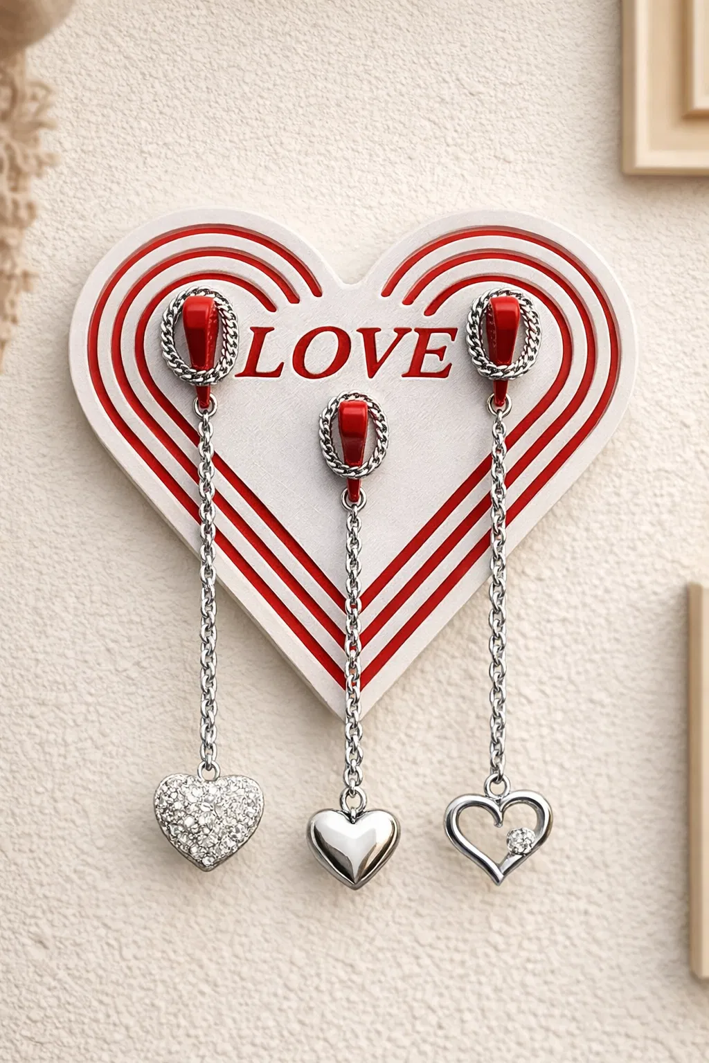 Mẫu giá treo trang sức hình trái tim làm quà tặng Valentine. Có thể đóng đinh để gắn lên tường nhanh gọn, tiện để treo dây chuyền và các món trang sức nhỏ gọn, giúp góc trưng bày gọn gàng hơn.