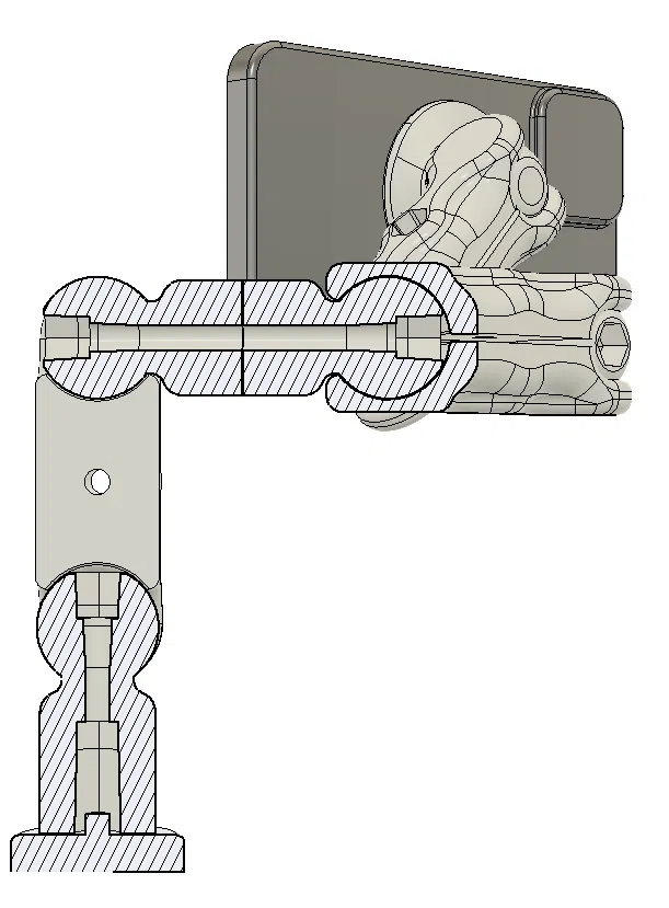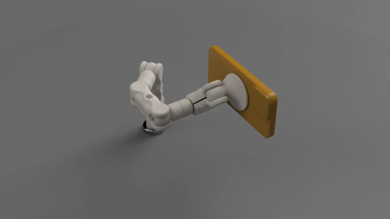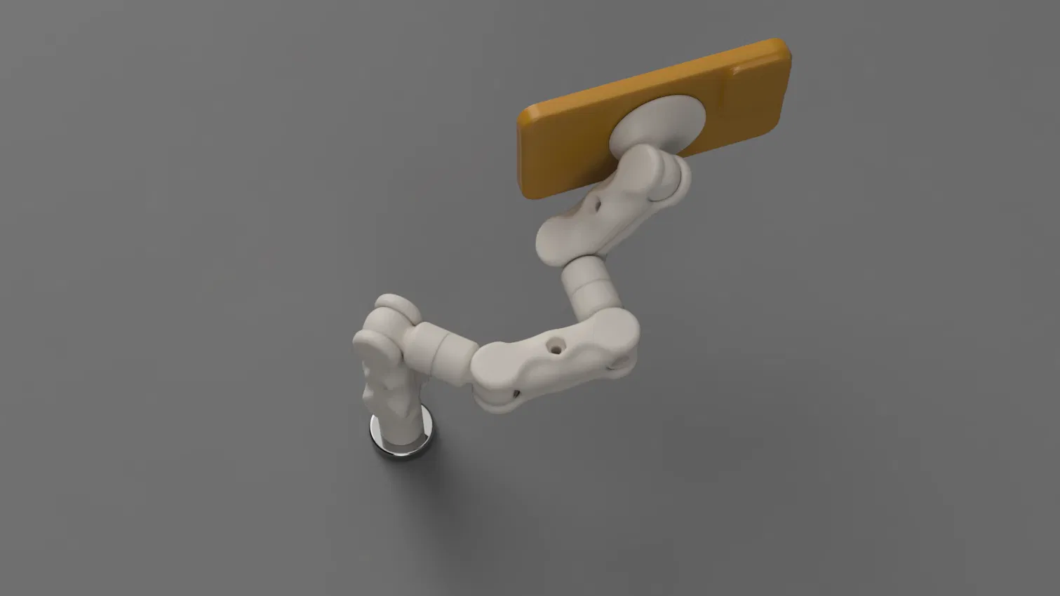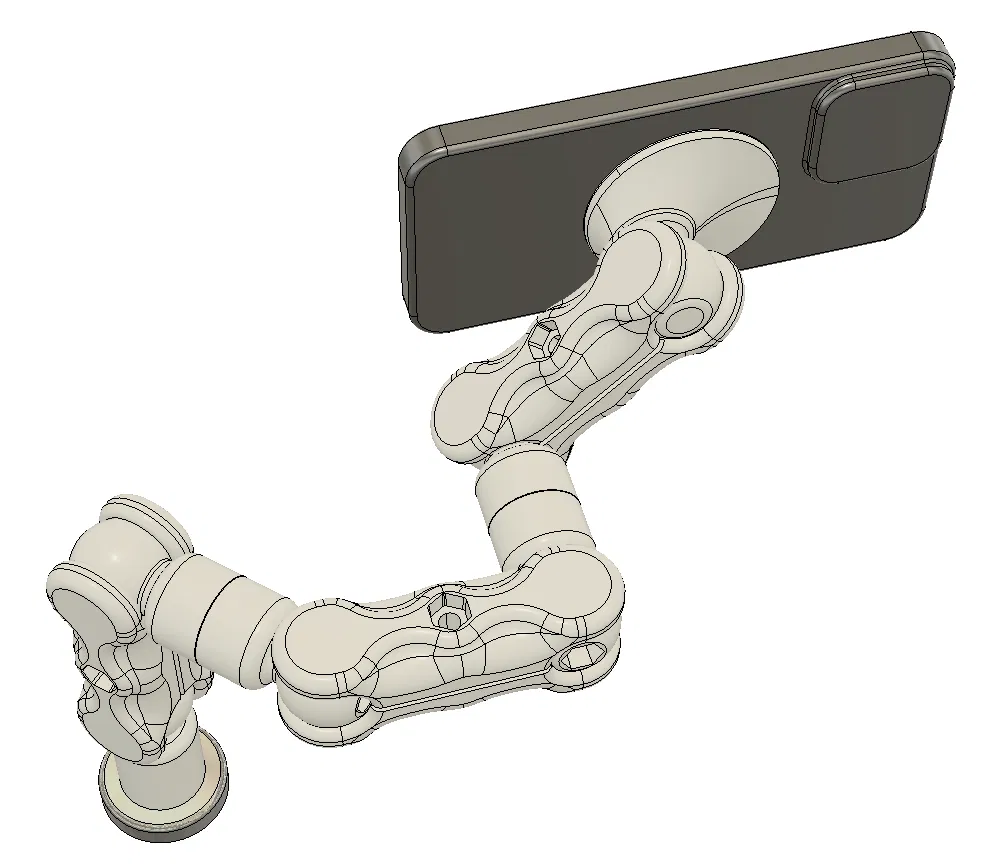 Giá đỡ điện thoại nhiều khớp, chỉnh linh hoạt và có nam châm. Đáy dùng long nut M6 (tới 27mm) để gắn fishing magnet screw M6; phía trên dán nam châm điện thoại ~58mm. Dùng bu-lông M6 (35mm/85mm), nên kèm washers, infill ≥15%.