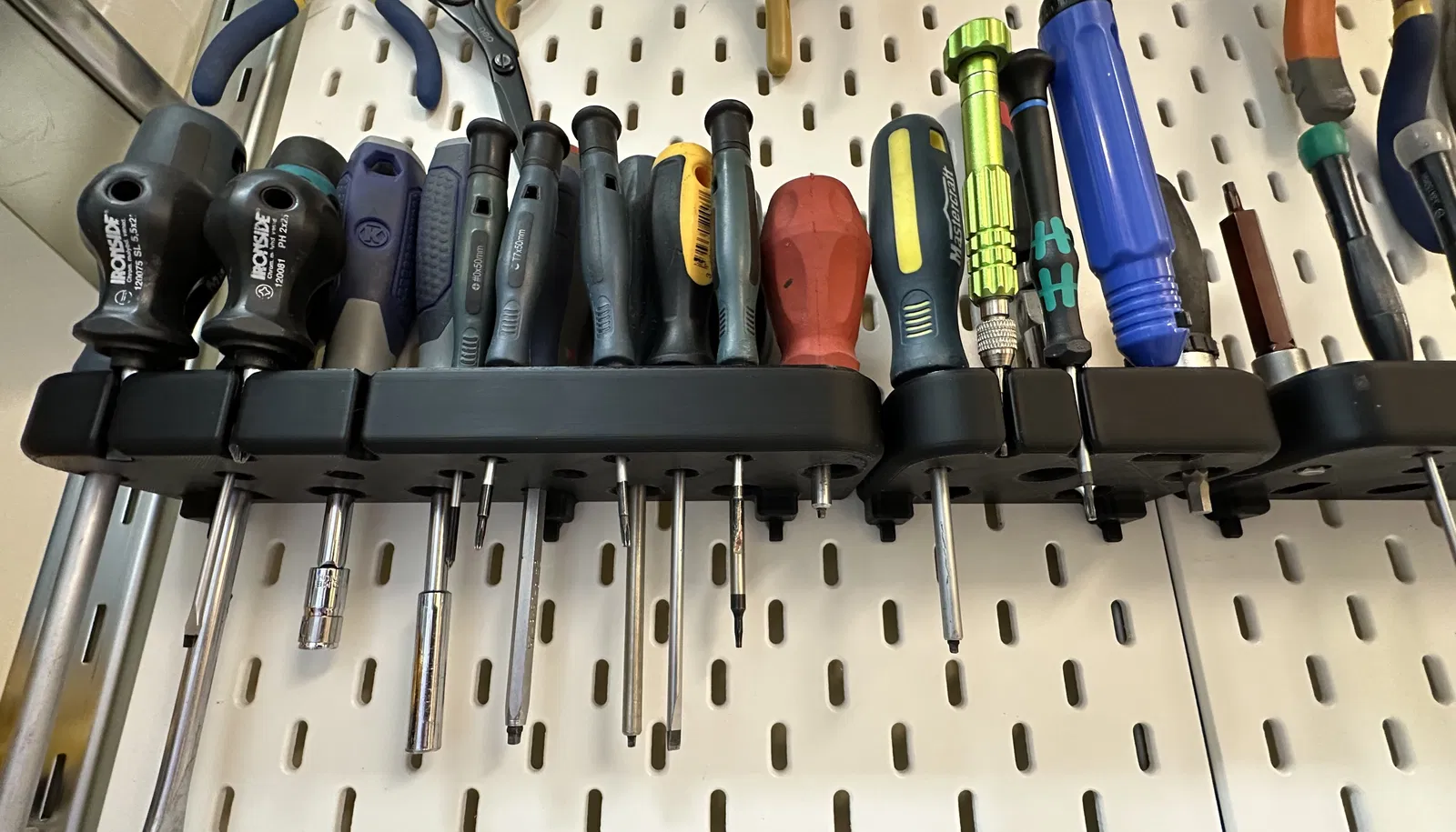 Tối ưu không gian làm việc với bộ giá cắm tua vít mật độ cao, thiết kế riêng cho hệ IKEA SKADIS. Mẫu này ra đời vì bực mình với mấy phụ kiện chính hãng lỏng lẻo; nó dùng cơ chế gắn cứng nên bám chắc, rút/đút dụng cụ không bị xê dịch.