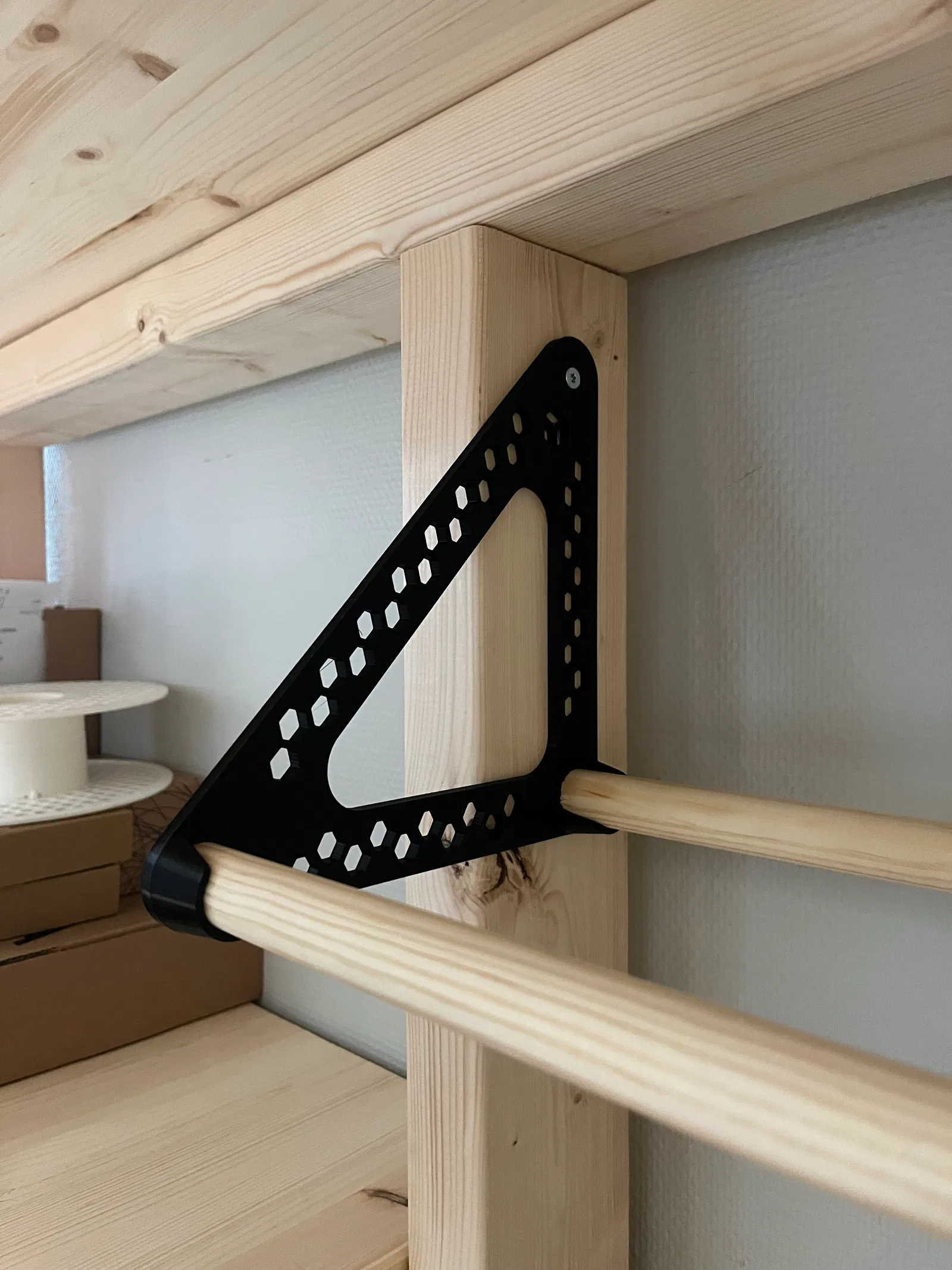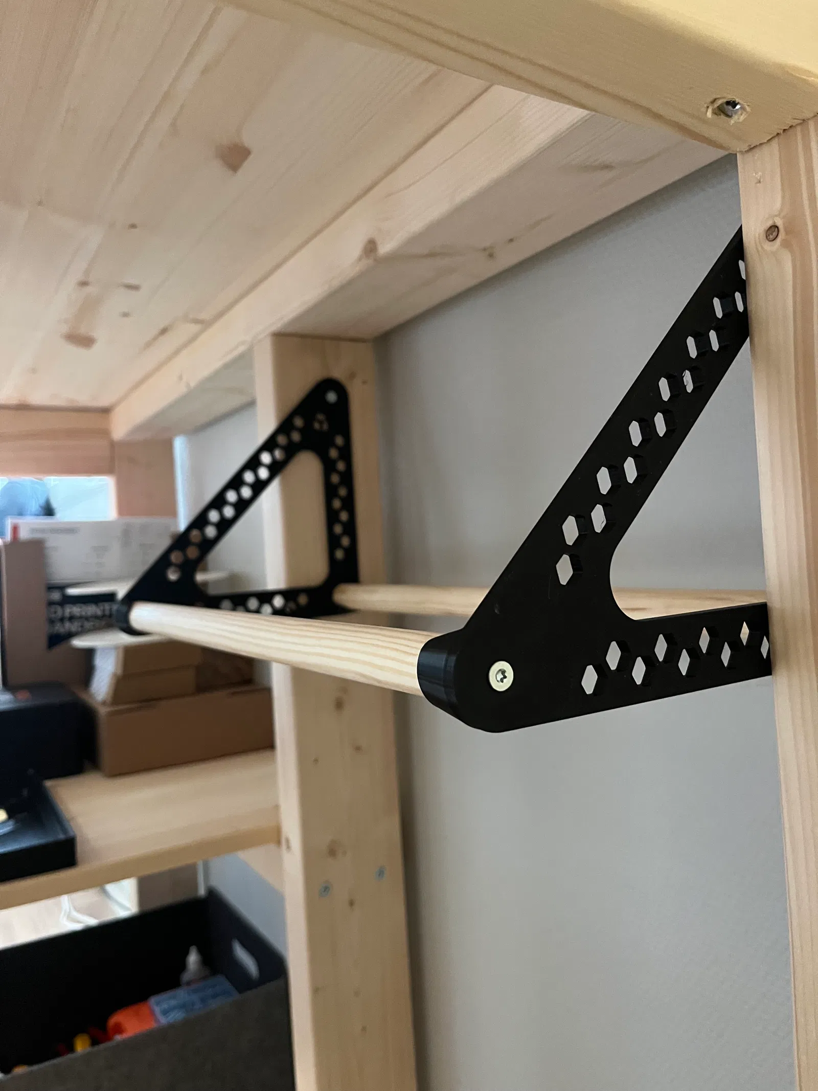 Đây là một bộ giữ filament tối giản nhưng chắc chắn, thiết kế để bắt trực tiếp vào khung gỗ hoặc kết cấu tương tự. Tấm plate được cố định bằng vít vào khung và đỡ hai thanh Ø10 mm, nơi cuộn filament sẽ nằm lên.