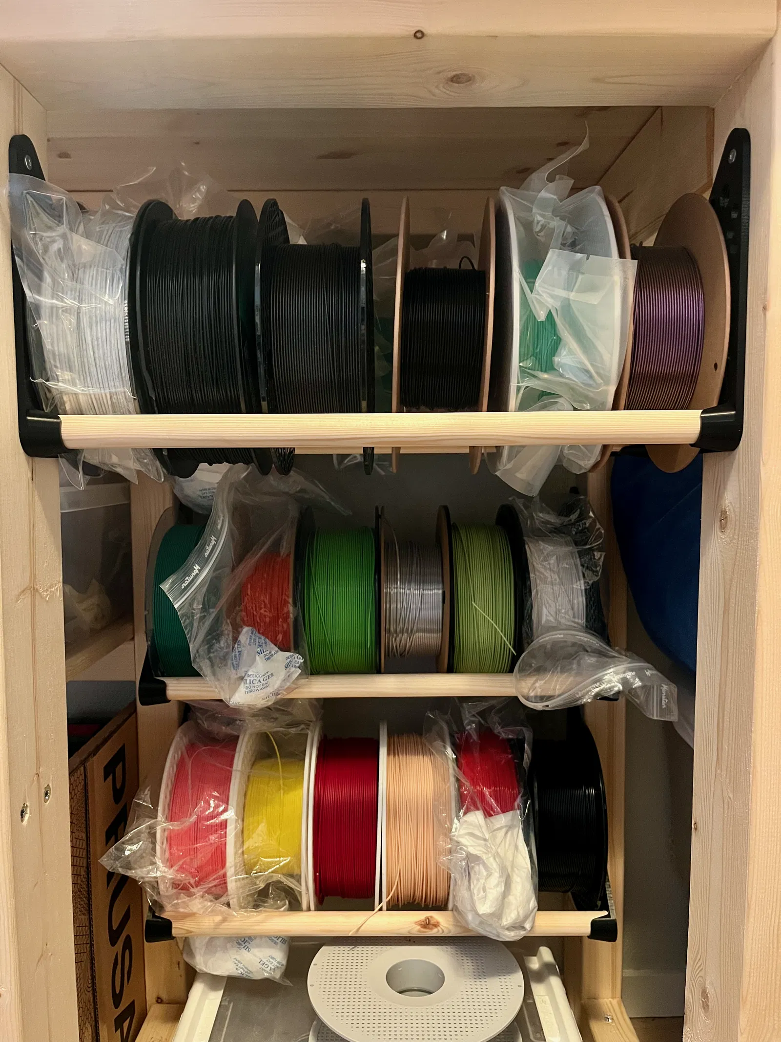Bộ giữ cuộn filament tối giản, bắt trực tiếp vào khung gỗ bằng vít gỗ, hỗ trợ 2 thanh Ø10 mm để đỡ cuộn. Mỗi lần lắp cần 1 bản thường + 1 bản mirrored, phù hợp enclosure, kệ hoặc khung tự làm.