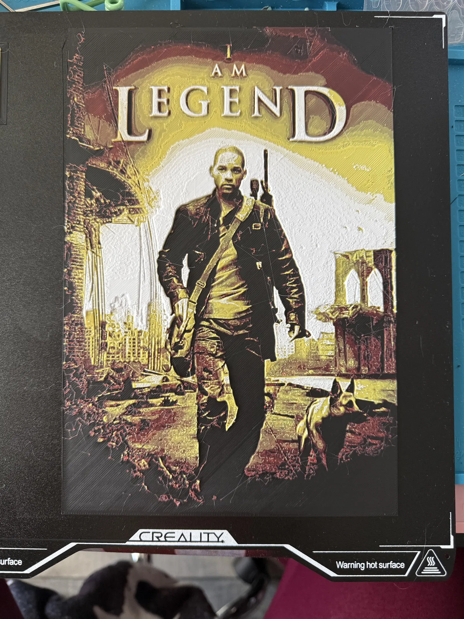Mẫu Hueforge 4 màu cho poster I Am Legend: in 2 perimeters, 100% infill, đổi layer height 0.2 rồi 0.16. Bắt đầu đen và đổi filament theo mốc Z; có thể pause trong slicer nếu không có CFS/AMS.