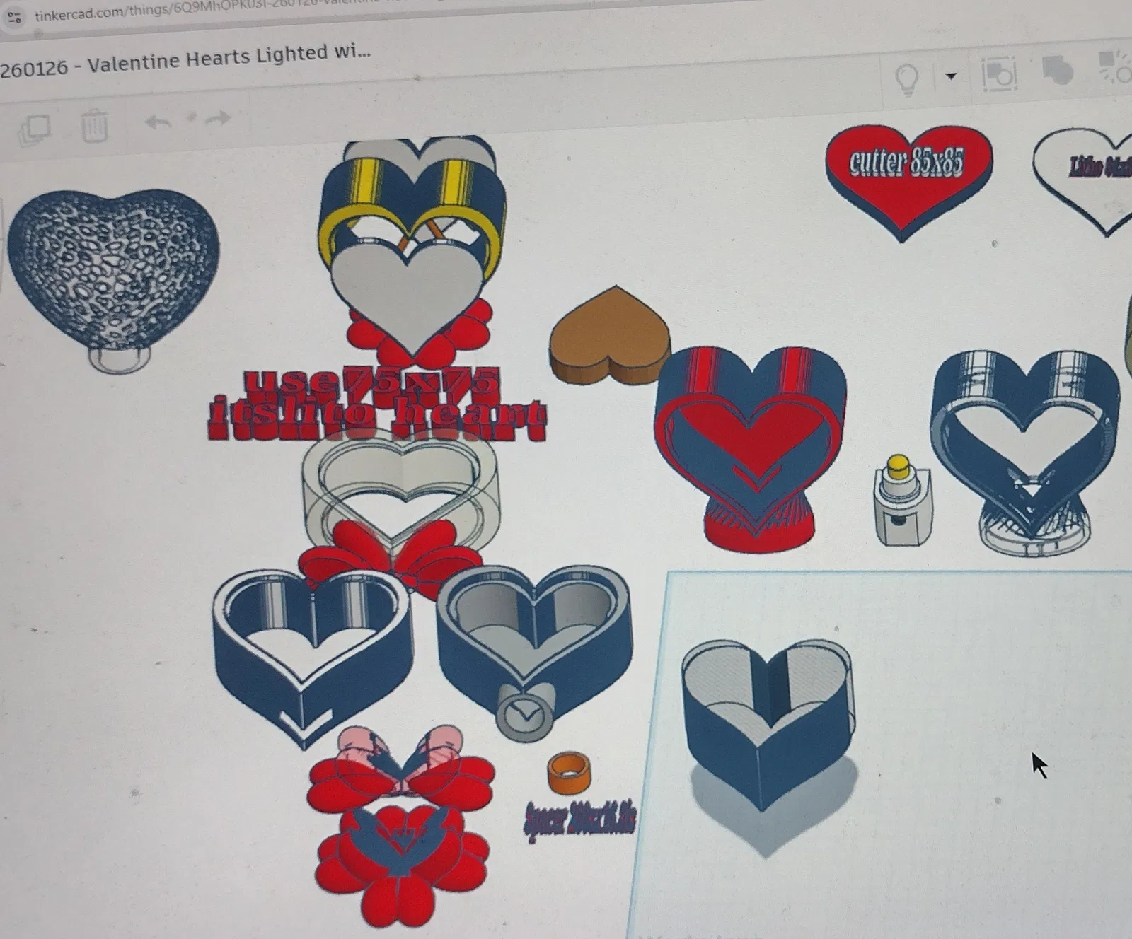 Model “Valentine Lighted Hearts” là bộ trái tim phát sáng làm quà tặng cho gia đình, bạn bè. Dùng mẫu Itslitho (84 wide, 3 max, 0.8 min) và có thể cần chỉnh Night Light Base cho vừa.