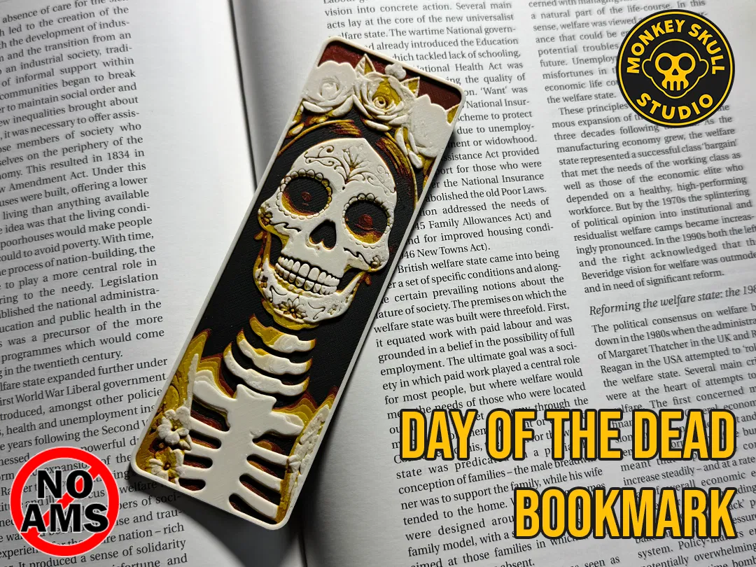 Bookmark đầu lâu Day of the Dead với chi tiết hoa văn và hoạ tiết lồng ngực, tối ưu để in lớp mịn, sắc nét và không cần support. Có 3MF kèm mốc đổi màu cho AMS hoặc đổi màu thủ công trên máy single-extruder.