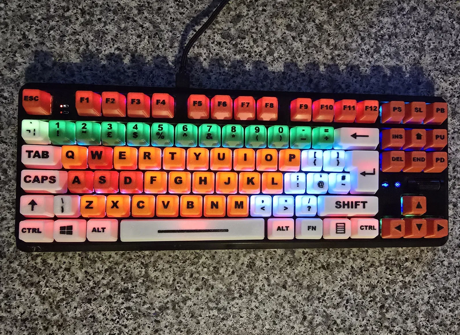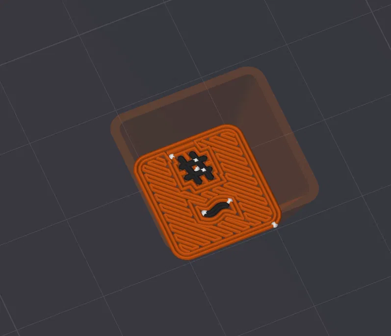 Mình đã thiết kế một bộ keycap mặt phẳng (flat-faced) tương thích Cherry MX đầy đủ, với các ký hiệu được dựng model hoàn chỉnh, tối ưu riêng cho in 3D nhiều màu. Phần viền của ký hiệu được khoét âm vào từng keycap 0,5 mm, tạo độ sâu vật lý và giúp máy in đắp thêm lớp để nét chữ rõ hơn. Nhờ vậy lettering đậm và sắc nét thấy rõ, đặc biệt hiệu quả khi dùng kèm đèn nền LED.