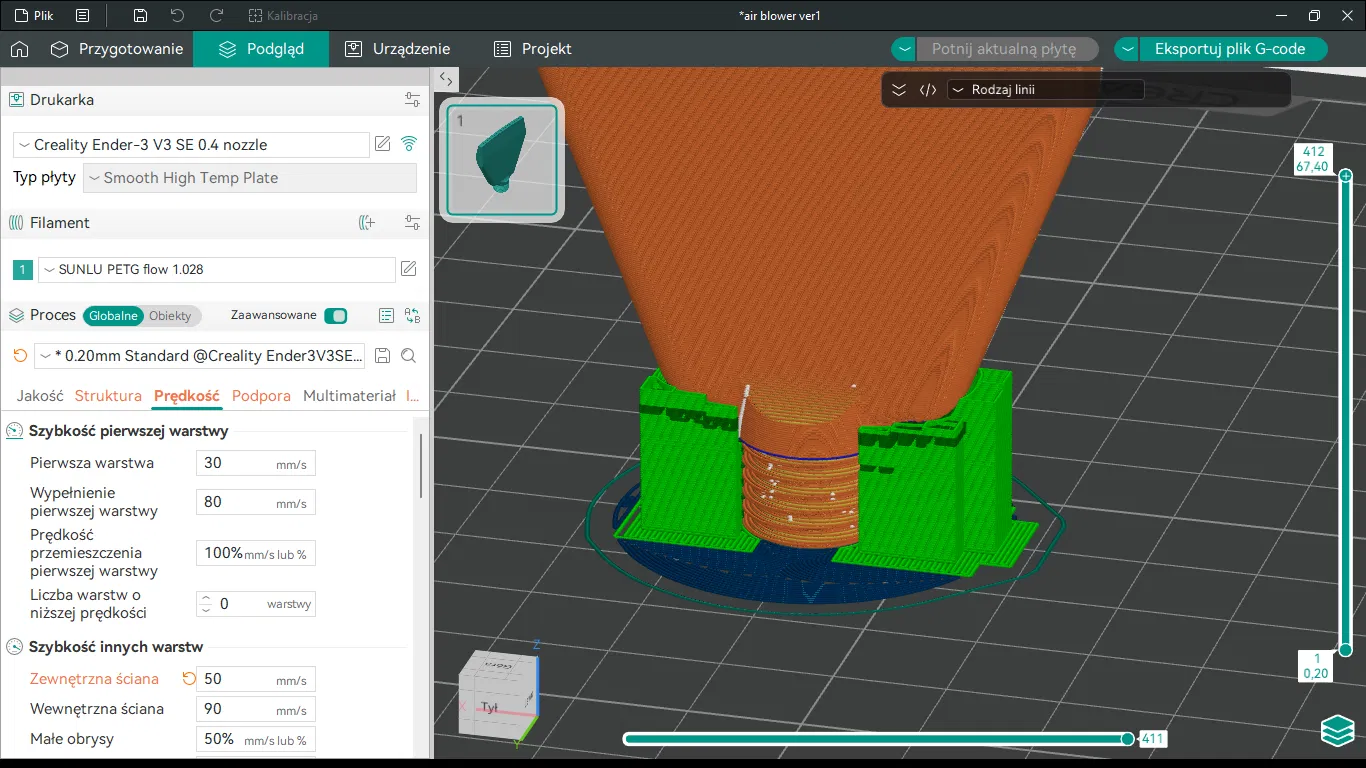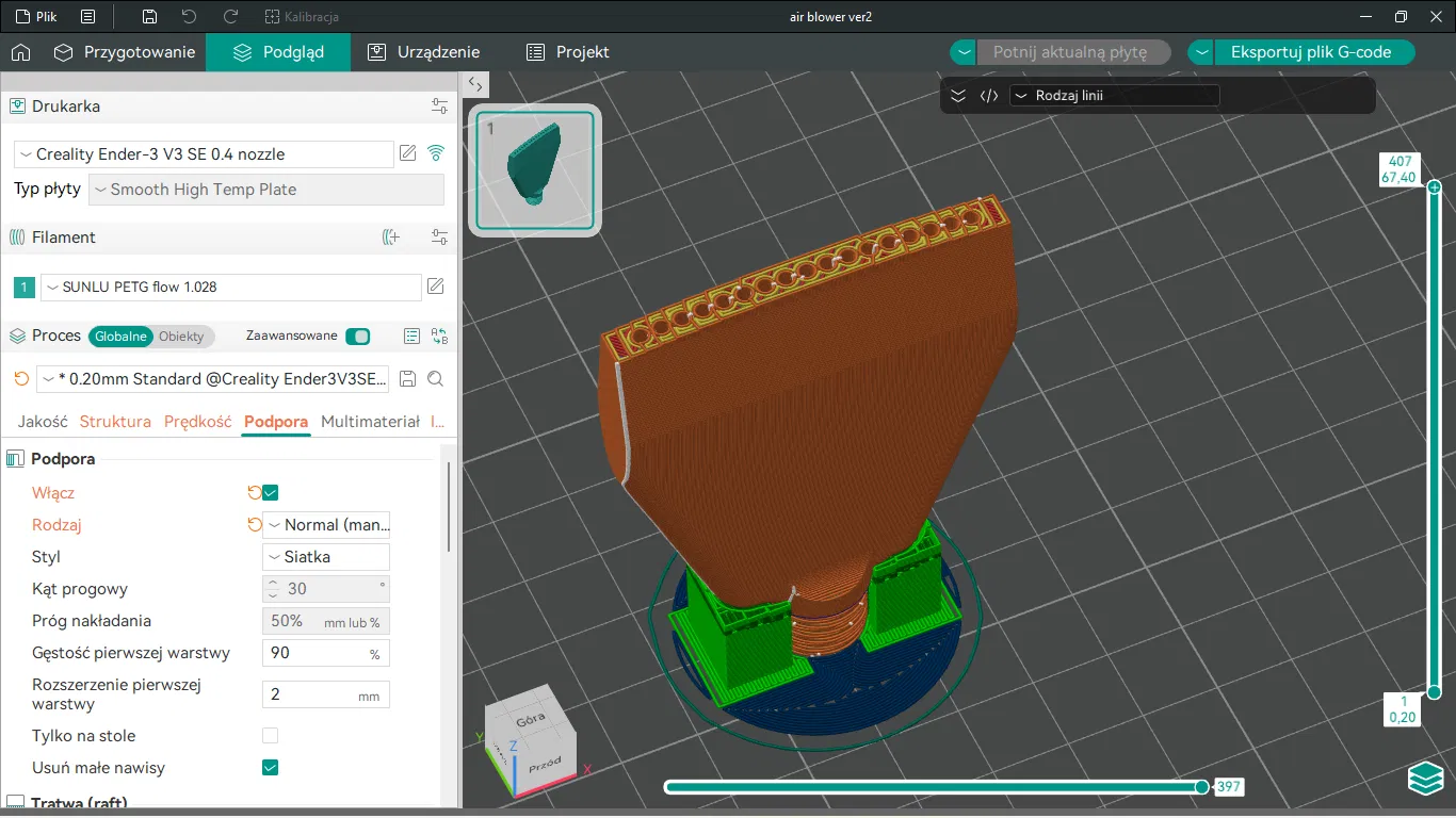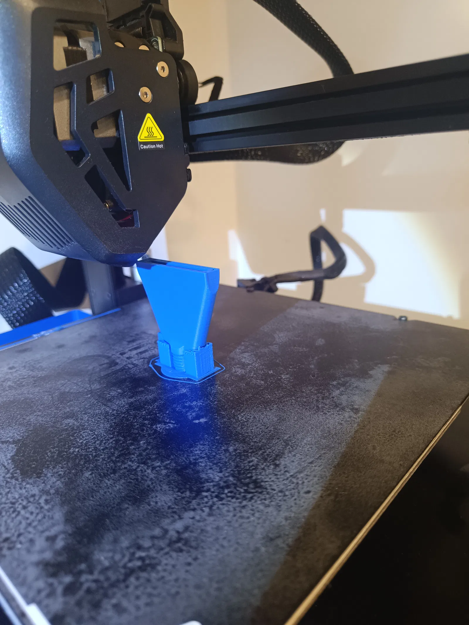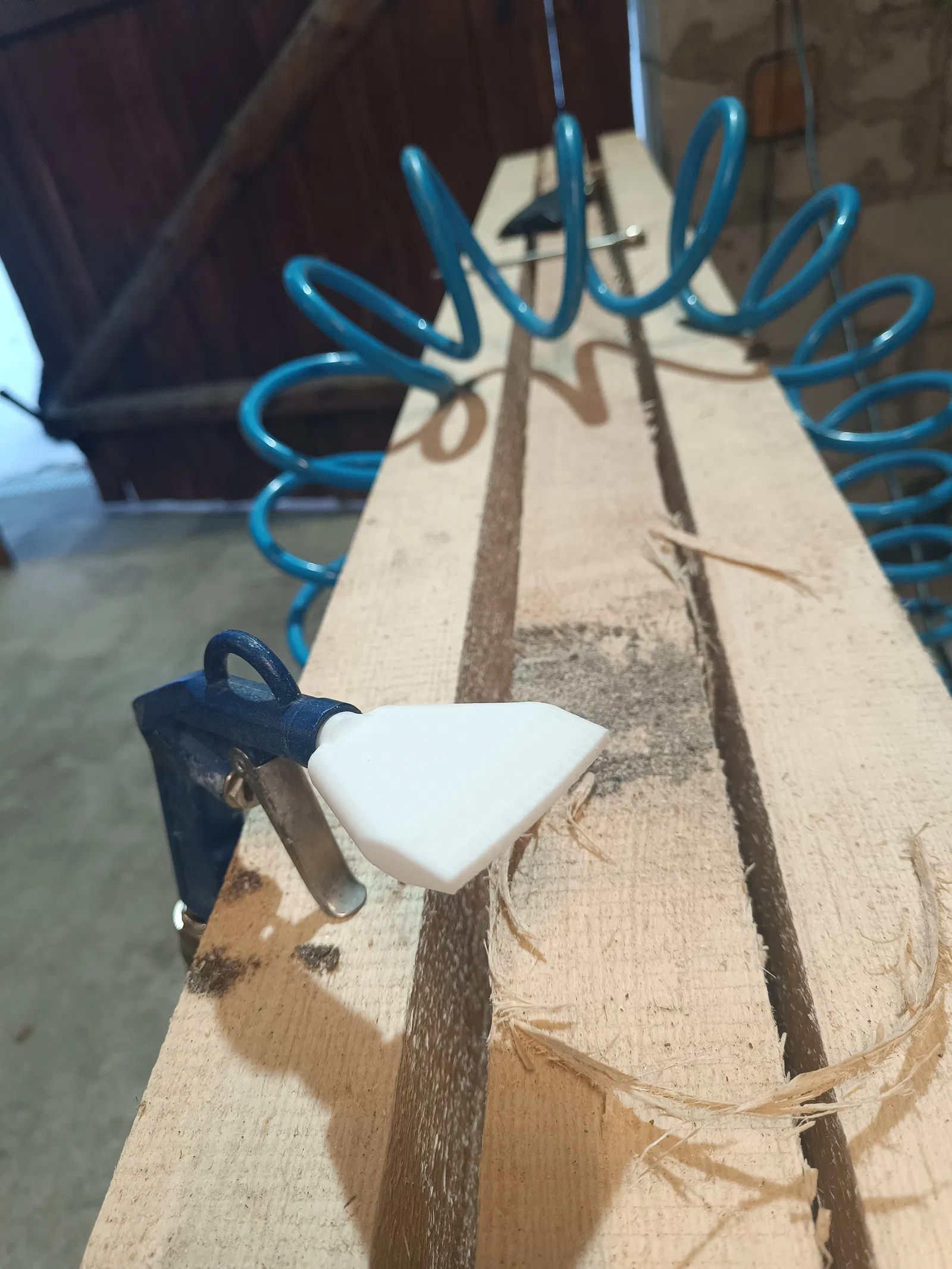 1 buồng được chia ra thành 17 kênh khí riêng biệt giúp tạo luồng thổi phẳng. Ren M12x1.5. In bằng PLA, chiều cao lớp 0.2, dùng supports và brim để ổn định hơn khi in.