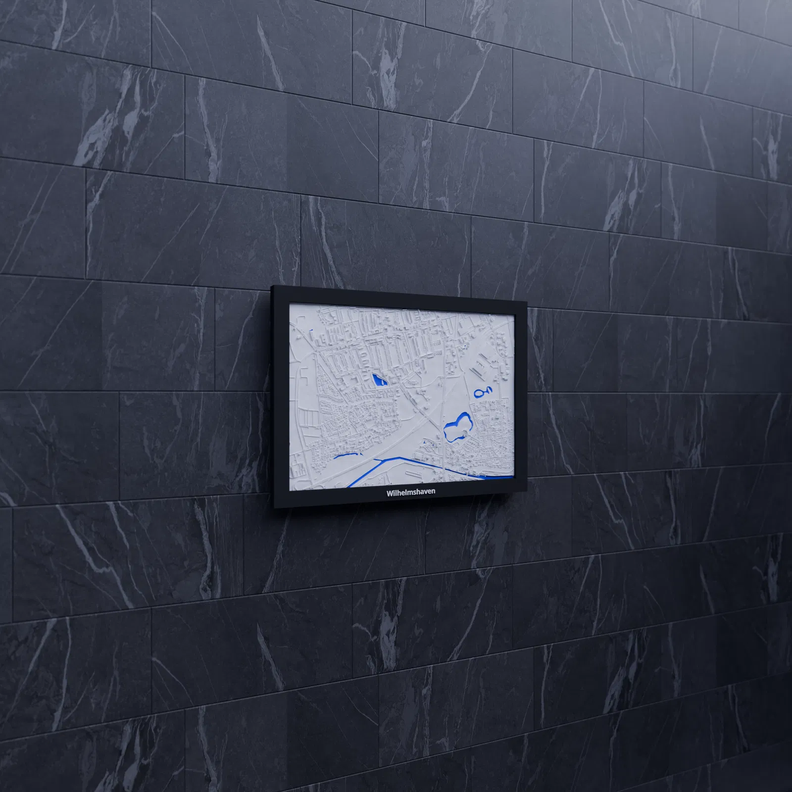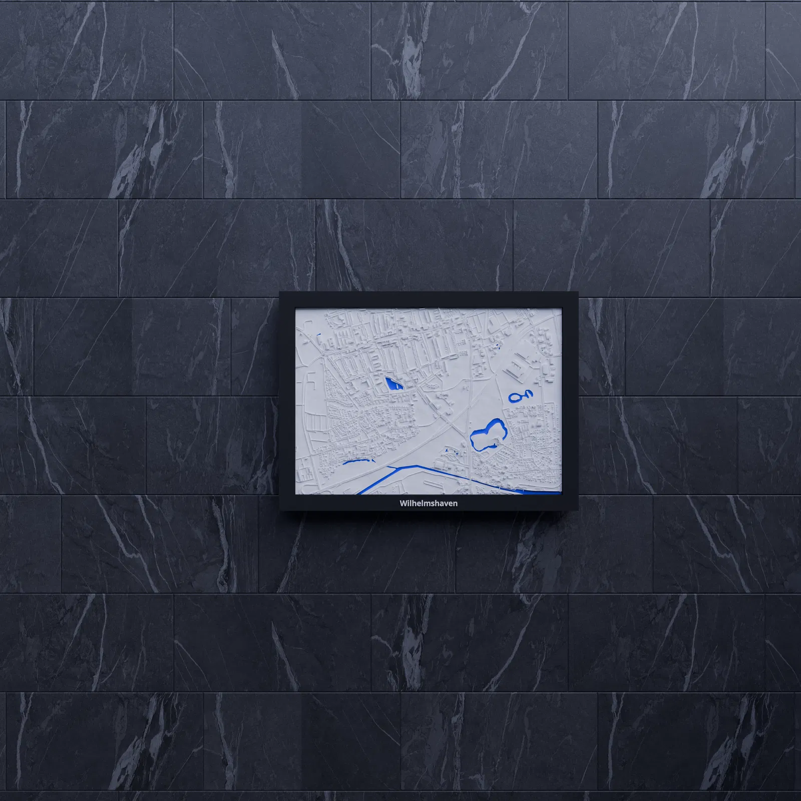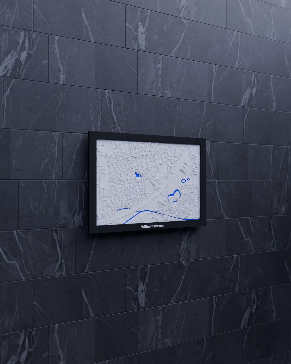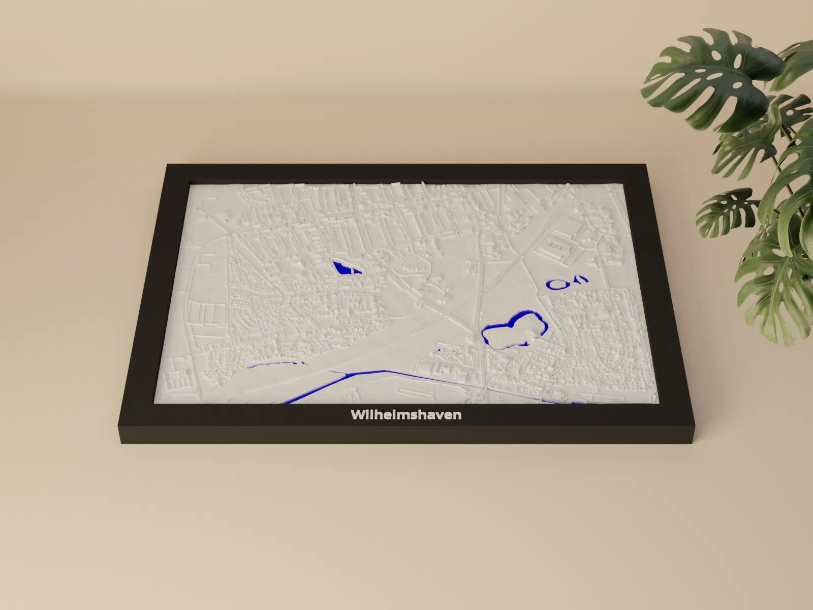 Mô hình địa hình thu nhỏ 3D của Wilhelmshaven (Đức), dựng từ dữ liệu địa lý, tỷ lệ ~16539:1. Kèm 3 lựa chọn frame có lỗ treo, phù hợp in single color hoặc multicolor để trưng bày, học tập hay quà tặng.