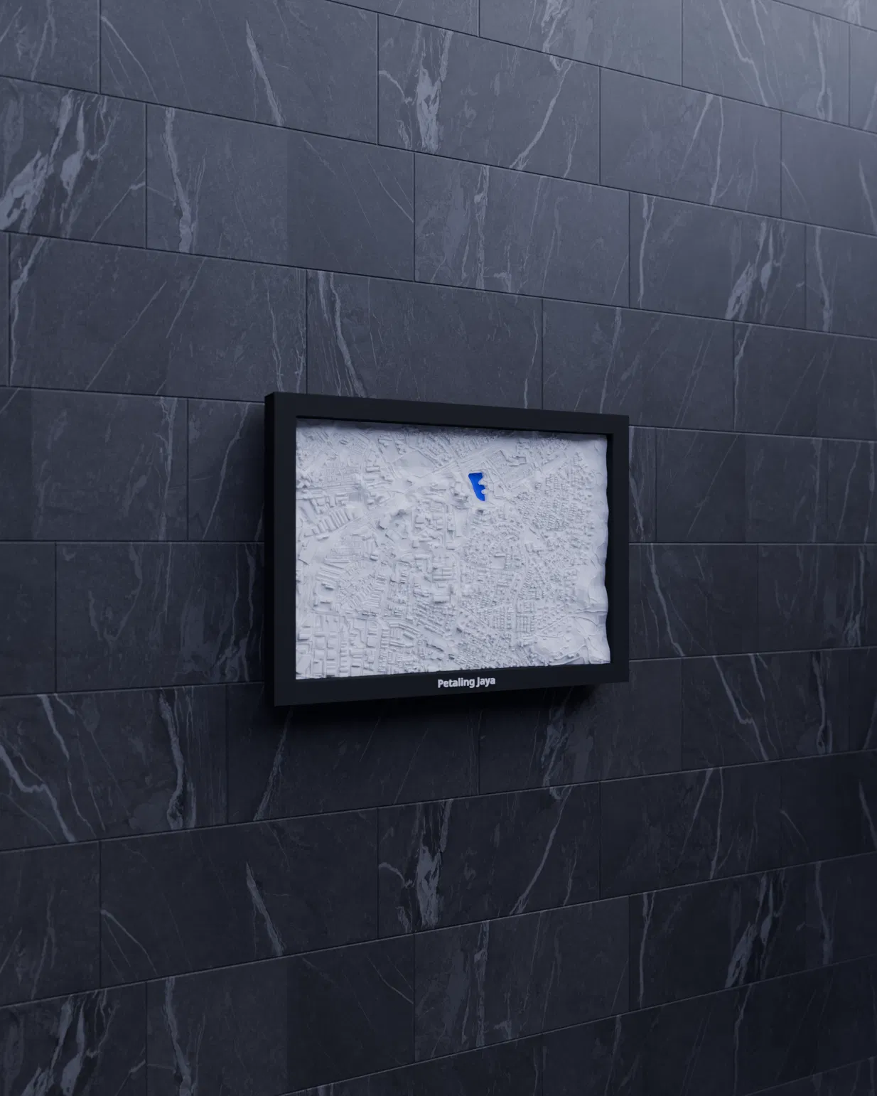Bản thu nhỏ địa hình Petaling Jaya (Malaysia) dựng từ dữ liệu địa lý, thu nhỏ khu vực 2.813 km x 1.959 km thành 170.5 x 119.5 mm (~16500:1). Có nhiều frame kèm lỗ treo, phù hợp in 3D trưng bày.