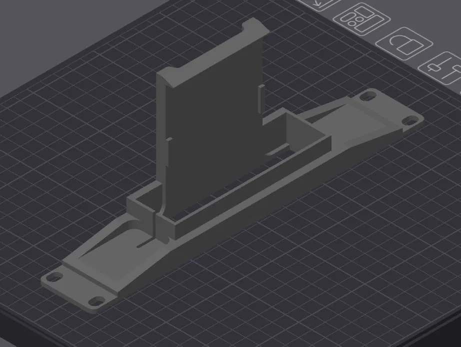 Ghi công cho nhà thiết kế gốc của cơ chế giữ này: router gài vào kệ rất gọn và khá chắc chắn. Mình in bằng PLA, nhưng có lẽ nên dùng PETG hoặc vật liệu khác chịu được chút nhiệt khi để trong rack. Mình có thêm supports thủ công ở bên dưới khu vực ngàm kẹp.