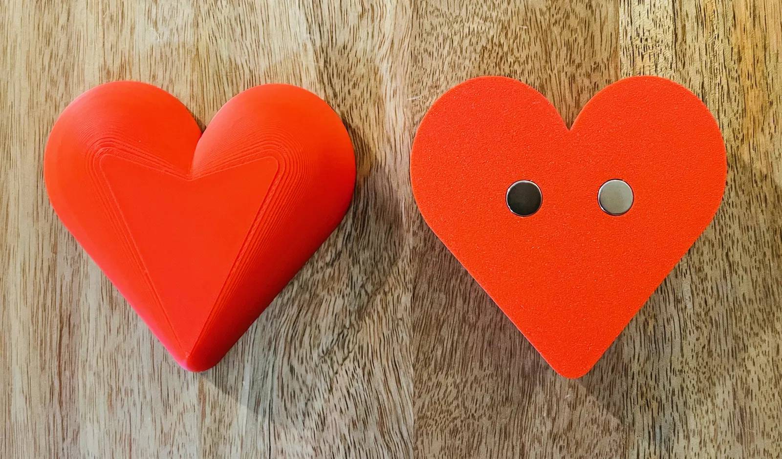 Magnet Heart là mẫu trái tim gồm 2 nửa có thể dính lại thành một trái tim hoàn chỉnh nhờ nam châm. Khi in nhiều cái, cần gắn 2 viên nam châm đúng chiều cực tính để các trái tim đều hút nhau, tránh bị đẩy.