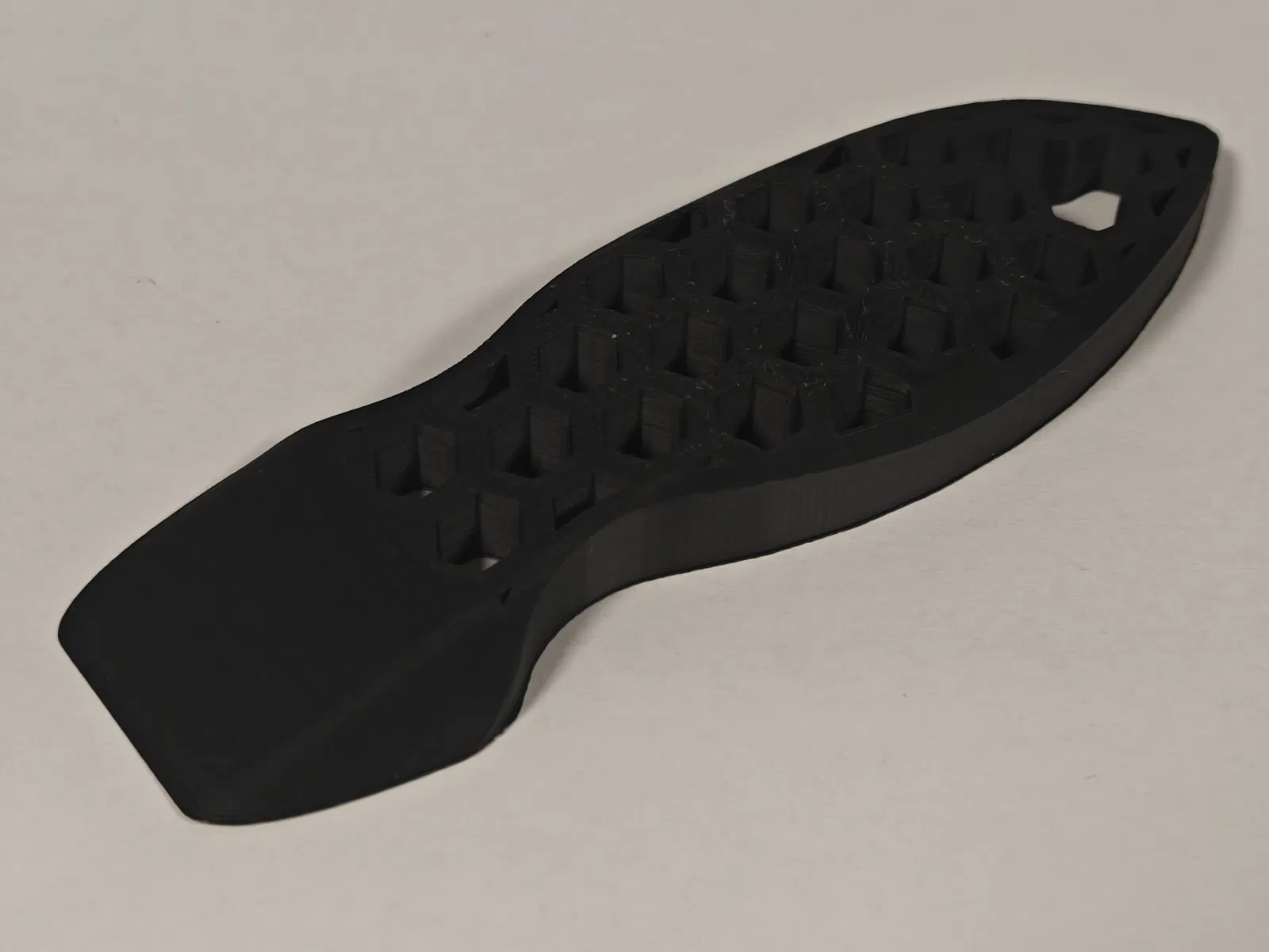 Scraper gỡ mẫu in thiết kế công thái học, tay cầm họa tiết honeycomb bám chắc, dễ cầm nắm. Mép nạy an toàn cho PEI/Glass, giúp bẩy mẫu ra nhẹ nhàng. Khuyến nghị in PETG hoặc PLA+.