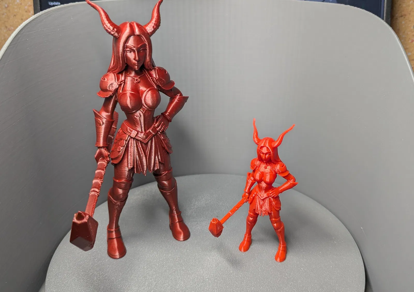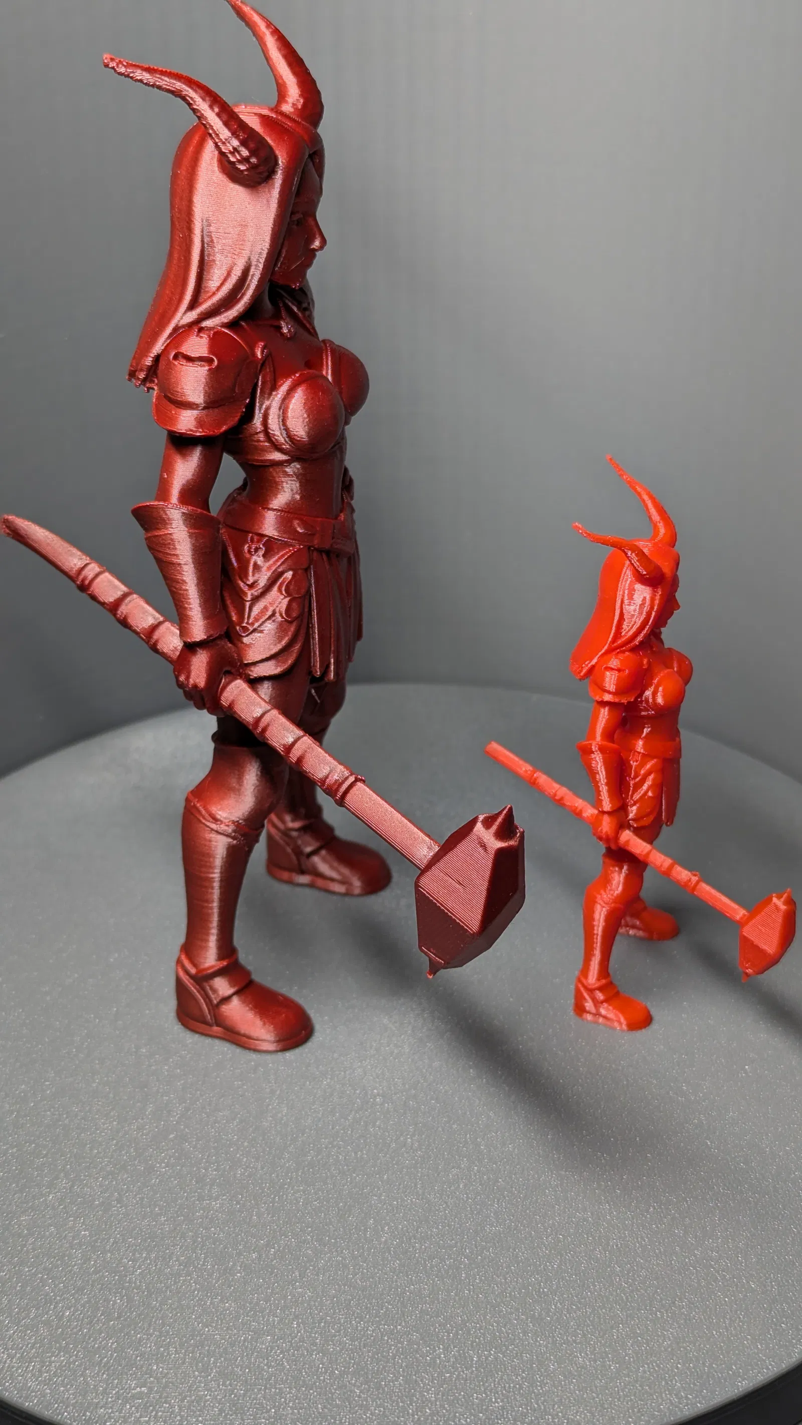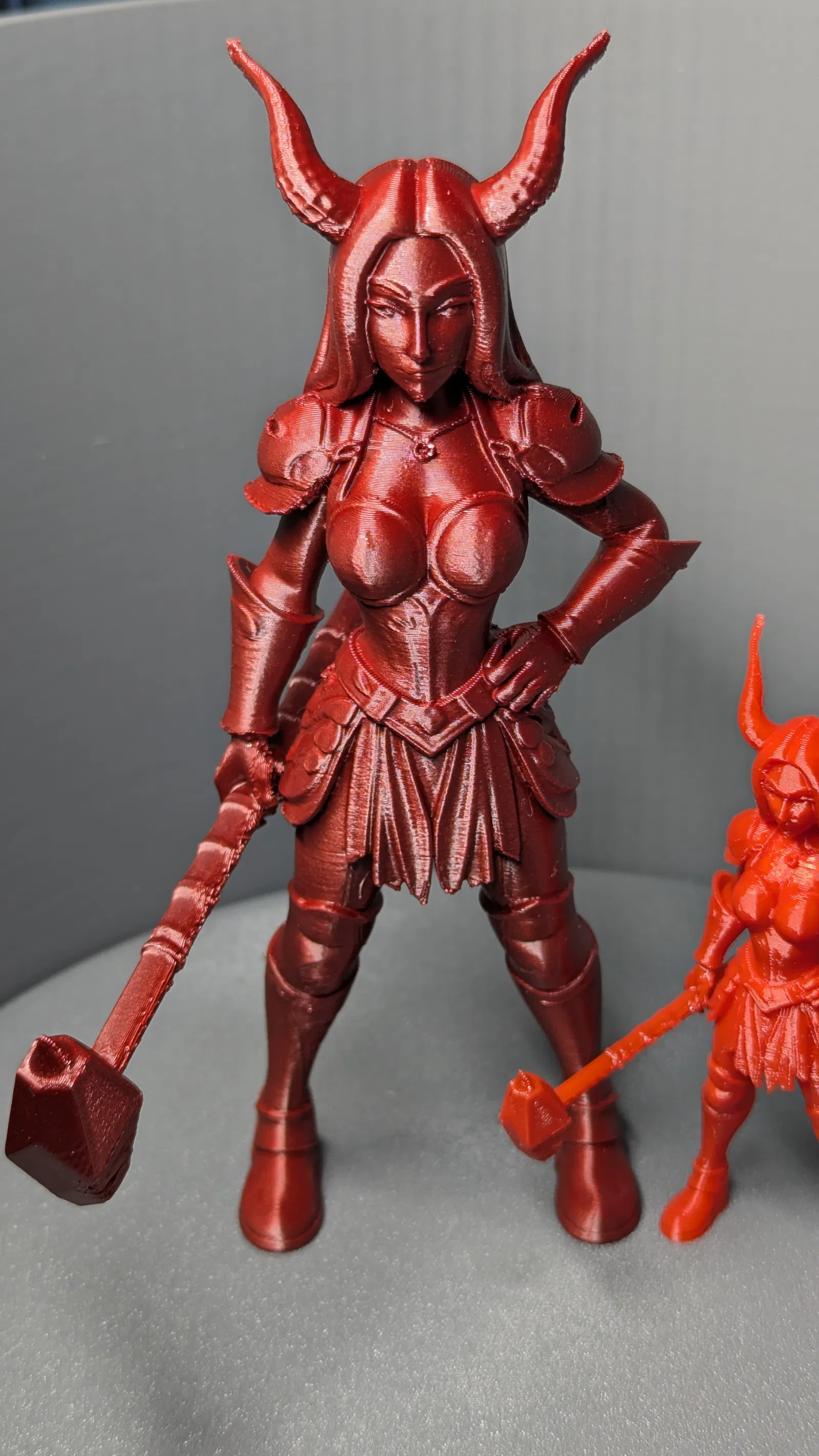 Mẫu Demoness cầm búa tạ (maul) với 2 kích thước 100mm và 180mm. Tác giả tạo từ MakerWorld Makerlab PrintU, rồi chỉnh sửa trong Meshmixer: thêm sừng, thay kiếm AI bằng maul. Maul và tay tách rời để in và dán sau.