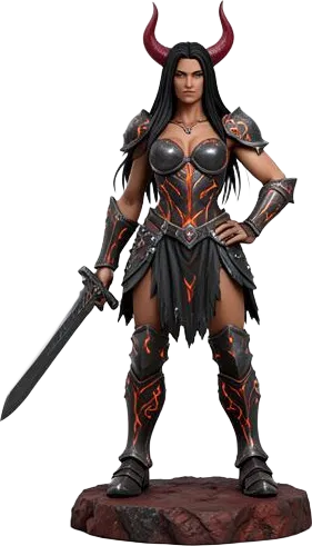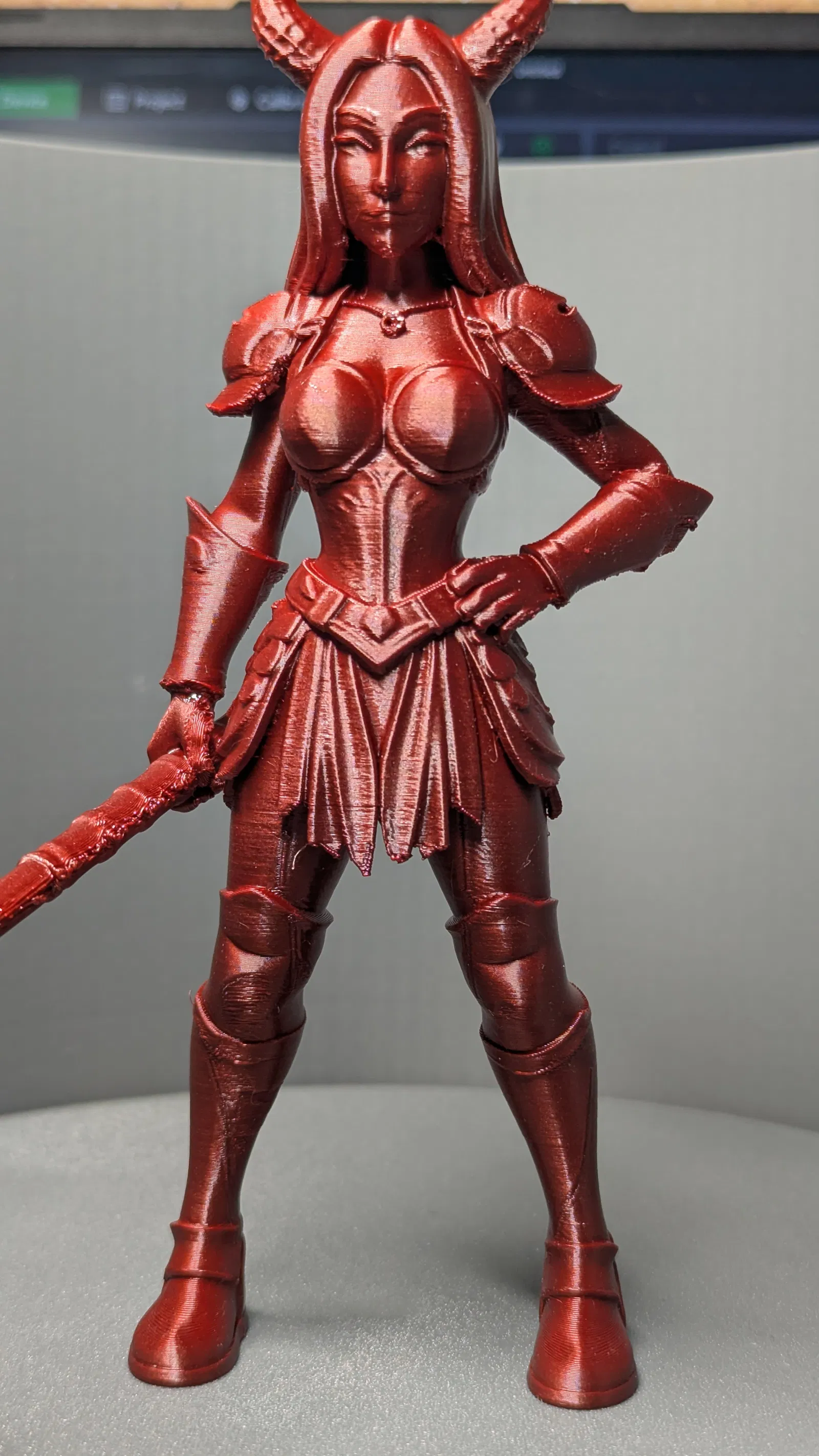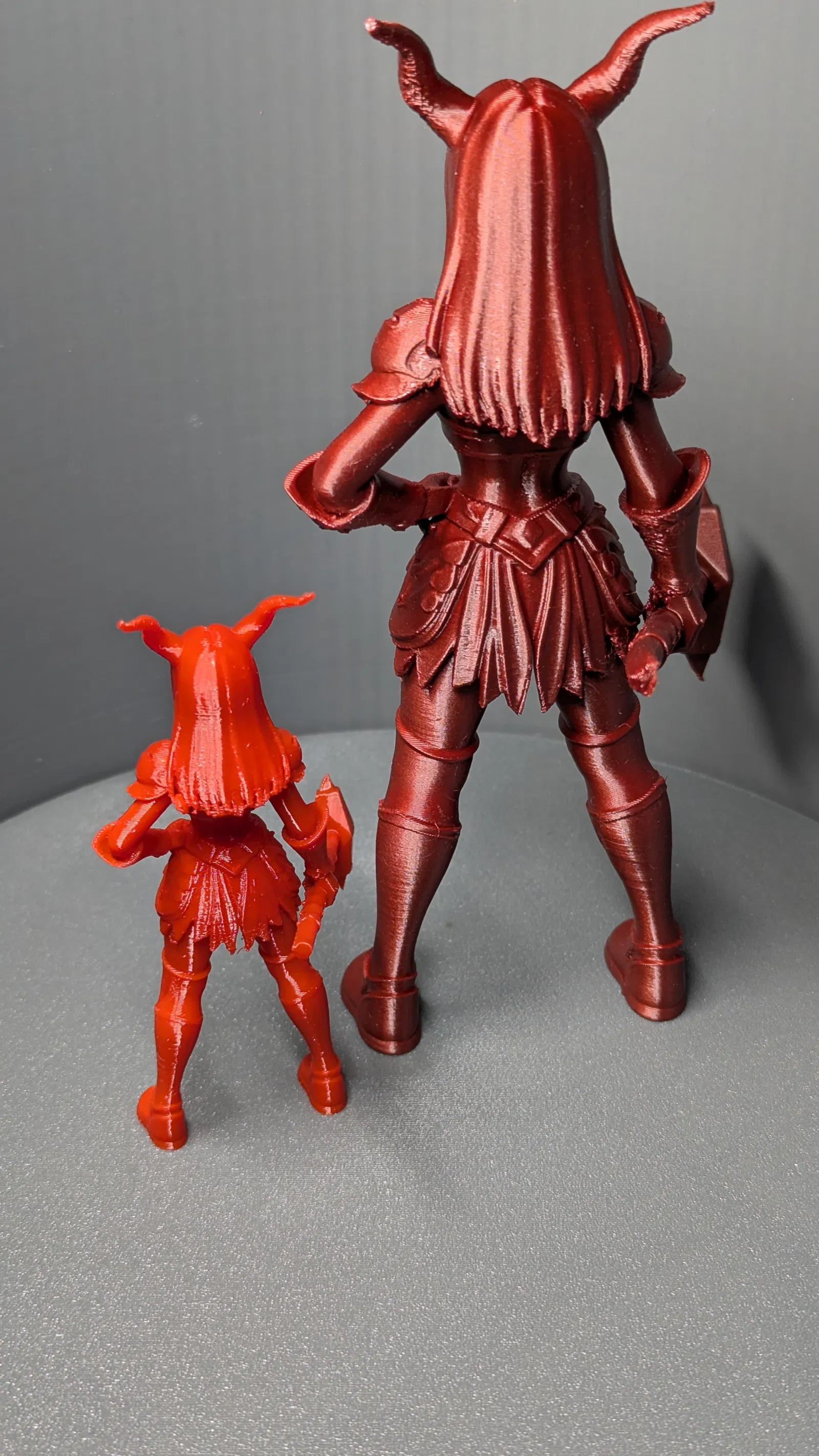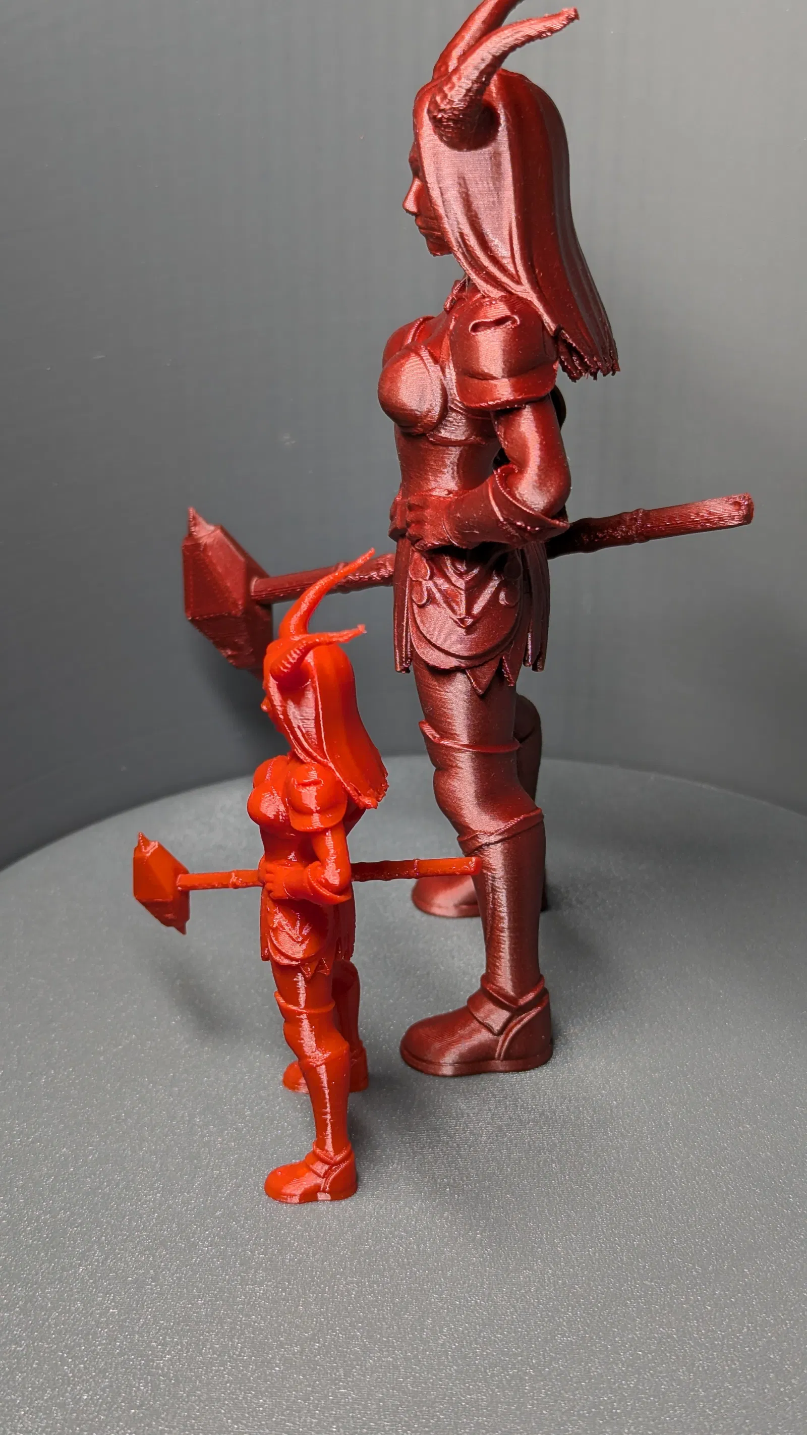 Mẫu Demoness cầm búa tạ (maul) với 2 kích thước 100mm và 180mm. Tác giả tạo từ MakerWorld Makerlab PrintU, rồi chỉnh sửa trong Meshmixer: thêm sừng, thay kiếm AI bằng maul. Maul và tay tách rời để in và dán sau.