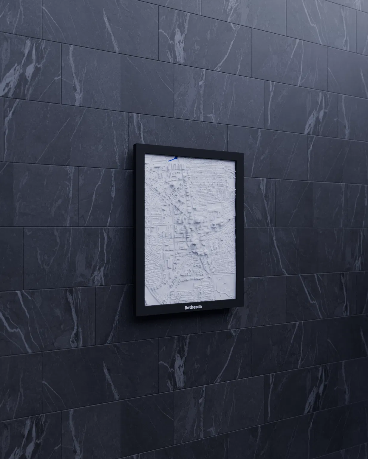 Miniature địa hình in 3D tái hiện Bethesda (Hoa Kỳ) từ dữ liệu địa lý, thu nhỏ khu vực 1.675 × 2.380 km thành 119.5 × 170.5 mm. Có nhiều frame kèm lỗ treo, hợp trưng bày, học tập hoặc decor.