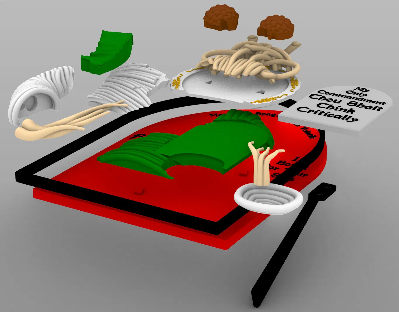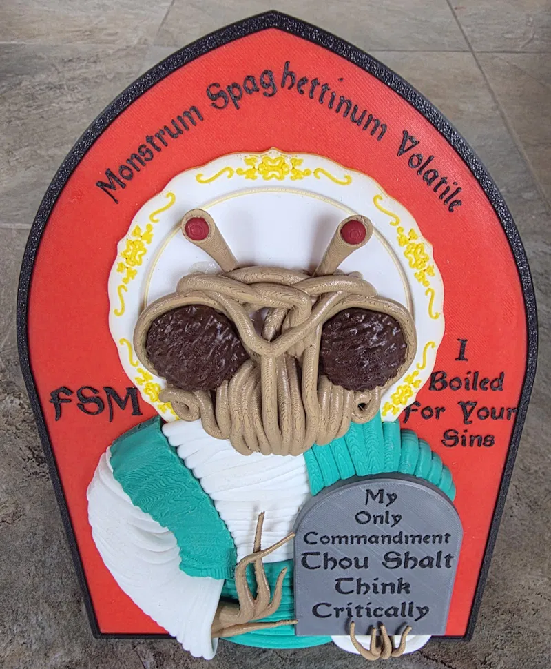 Mẫu Flying Spaghetti Monster dạng chia nhiều mảnh, tiện in nhiều màu hoặc sơn. Có backplate, stone tablet và dinner plate/halo; có lỗ keyhole để treo hoặc gắn stand. Khuyến nghị nozzle 0.4, layer 0.2.