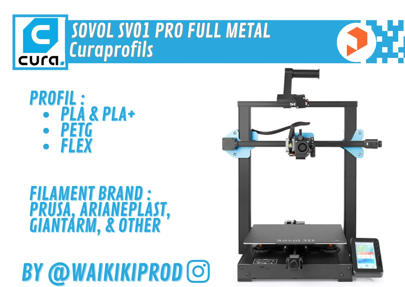 Bộ CuraProfils cho Sovol SV01 Pro Full Metal (dùng heatbreak fullmetal), tối ưu cài đặt in trong Cura 5.0.0 và các thiết lập liên quan. Có kèm link heatbreak và liên kết theo dõi tác giả.